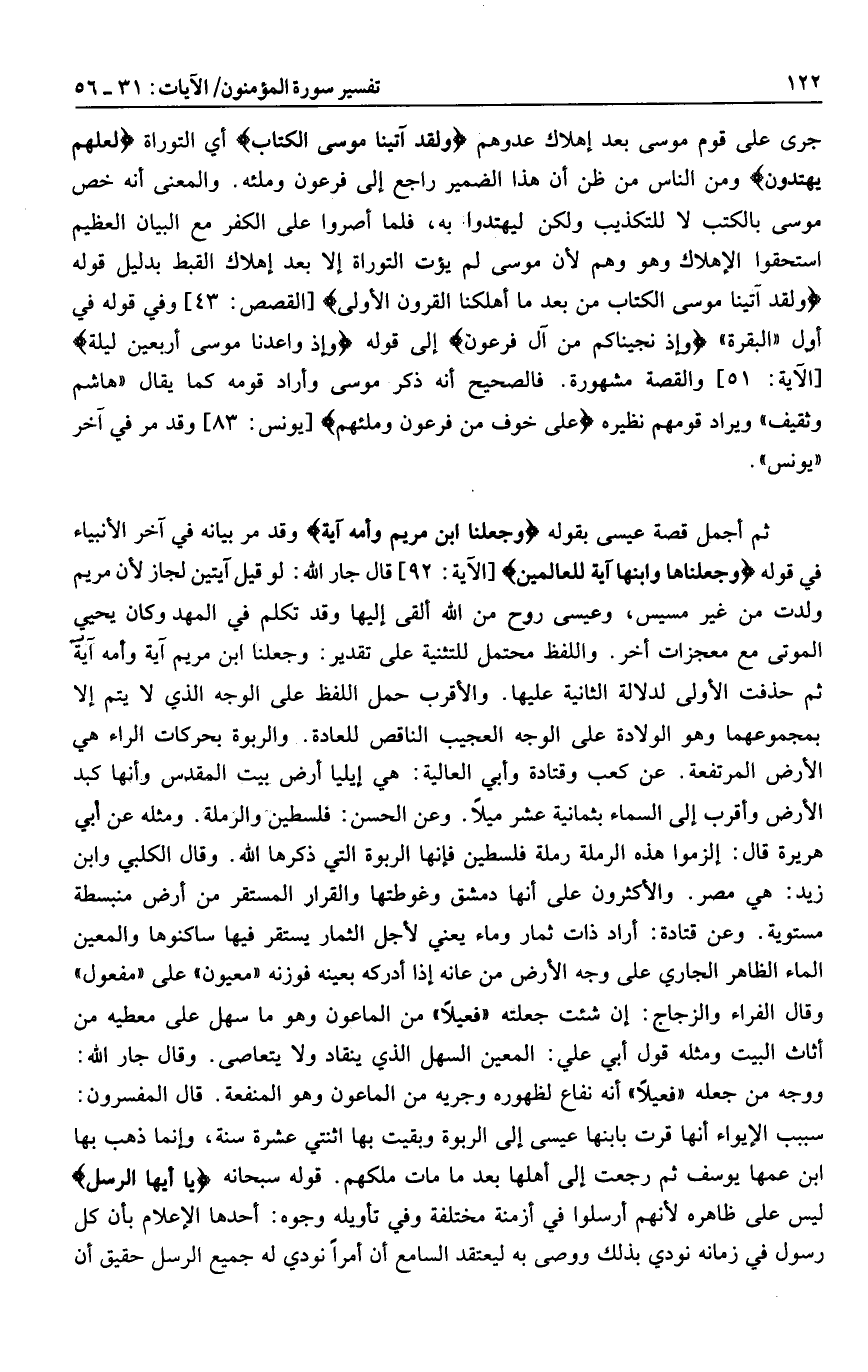 ثم أجمل قصة عيسى بقوله وَجَعَلْنَا ابْنَ مَرْيَمَ وَأُمَّهُ آيَةً وقد مر بيانه في آخر الأنبياء في قوله وَجَعَلْناها وَابْنَها آيَةً لِلْعالَمِينَ [الآية: 92] قال جار الله: لو قيل آيتين لجاز لأن مريم ولدت من غير مسيس، وعيسى روح من الله ألقى إليها وقد تكلم في المهد وكان يحيى الموتى مع معجزات أخر. واللفظ محتمل للتثنية على تقدير: وجعلنا ابن مريم آية وأمه آية ثم حذفت الأولى لدلالة الثانية عليها. والأقرب حمل اللفظ على الوجه الذي لا يتم إلا بمجموعهما وهو الولادة على الوجه العجيب الناقص للعادة. والربوة بحركات الراء هي الأرض المرتفعة. عن كعب وقتادة وأبي العالية: هي إيليا أرض بيت المقدس وأنها كبد الأرض وأقرب إلى السماء بثمانية عشر ميلا. وعن الحسن: فلسطين والرملة. ومثله عن أبي هريرة قال: الزموا هذه الرملة رملة فلسطين فإنها الربوة التي ذكرها الله. وقال الكلبي وابن زيد: هي مصر. والأكثرون على أنها دمشق وغوطتها والقرار المستقر من أرض منبسطة مستوية. وعن قتادة: أراد ذات ثمار وماء يعني لأجل الثمار يستقر فيها ساكنوها والمعين الماء الظاهر الجاري على وجه الأرض من عانه إذا أدركه بعينه فوزنه «معيون» على «مفعول» وقال الفراء والزجاج: إن شئت جعلته «فعيلا» من الماعون وهو ما سهل على معطيه من أثاث البيت ومثله قول أبي علي: المعين السهل الذي ينقاد ولا يتعاصى. وقال جار الله: