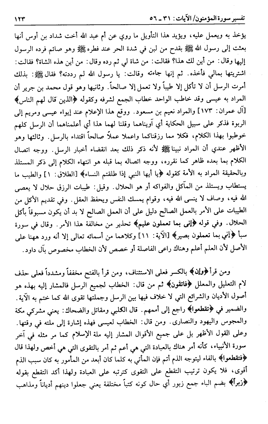 ومن قرأ وَإِنَّ بالكسر فعلى الاستئناف، ومن قرأ بالفتح مخففا ومشددا فعلى حذف لام التعليل والمعلل فَاتَّقُونِ ثم من قال: الخطاب لجميع الرسل فالمشار إليه بهذه هو أصول الأديان والشرائع التي لا خلاف فيها بين الرسل وجملتها تقوى الله كما ختم به الآية.