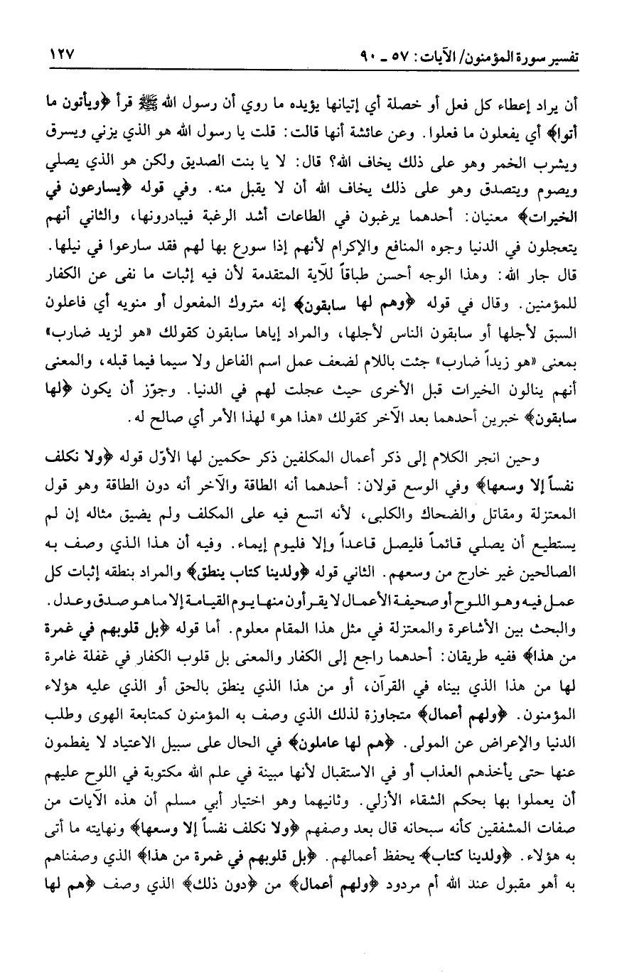 وحين انجر الكلام إلى ذكر أعمال المكلفين ذكر حكمين لها الأوّل قوله وَلا نُكَلِّفُ نَفْساً إِلَّا وُسْعَها وفي الوسع قولان: أحدهما أنه الطاقة والآخر أنه دون الطاقة وهو قول المعتزلة ومقاتل والضحاك والكلبي، لأنه اتسع فيه على المكلف ولم يضيق مثاله إن لم يستطيع أن يصلي قائما فليصل قاعدا وإلا فليوم إيماء. وفيه أن هذا الذي وصف به الصالحين غير خارج من وسعهم. الثاني قوله وَلَدَيْنا كِتابٌ يَنْطِقُ والمراد بنطقه إثبات كل عمل فيه وهو اللوح أو صحيفة الأعمال لا يقرأون منها يوم القيامة إلا ما هو صدق وعدل.