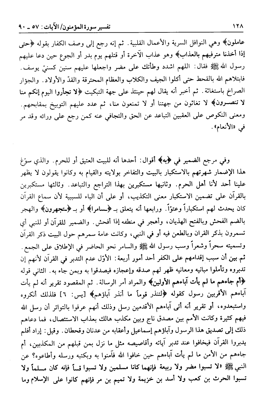 وفي مرجع الضمير في بِهِ أقوال: أحدها أنه للبيت العتيق أو للحرم. والذي سوّغ هذا الإضمار شهرتهم بالاستكبار بالبيت والتفاخر بولايته والقيام به وكانوا يقولون لا يظهر علينا أحد لأنا أهل الحرم. وثانيها مستكبرين بهذا التراجع والتباعد. وثالثها مستكبرين بالقرآن على تضمين الاستكبار معنى التكذيب، أو على أن الباء للسببية لأن سماع القرآن كان يحدث لهم استكبارا وعتوّا. ورابعها أنه يتعلق ب سامِراً أو ب تَهْجُرُونَ والهجر بالضم الفحش وبالفتح الهذيان، وأهجر في منطقه إذا أفحش. والضمير للقرآن أو للنبي أي تسمرون بذكر القرآن وبالطعن فيه أو في النبي، وكانت عامة سمرهم حول البيت ذكر القرآن وتسميته سحرا وشعرا وسب رسول الله صلى الله عليه وسلم والسامر نحو الحاضر في الإطلاق على الجمع.