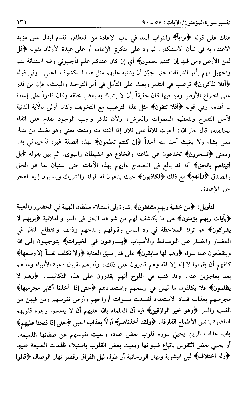مِنْ خَشْيَةِ رَبِّهِمْ مُشْفِقُونَ إشارة إلى استيلاء سلطان الهيبة في الحضور والغيبة بِآياتِ رَبِّهِمْ يُؤْمِنُونَ هي ما يكاشف لهم من شواهد الحق في السر والعلانية بِرَبِّهِمْ لا يُشْرِكُونَ هو ترك الملاحظة في رد الناس وقبولهم ومدحهم وذمهم وانقطاع النظر في المضار والضار عن الوسائط والأسباب يُسارِعُونَ فِي الْخَيْراتِ يتوجهون إلى الله وينقطعون عما سواه وَهُمْ لَها سابِقُونَ على قدر سبق العناية وَلا نُكَلِّفُ نَفْساً إِلَّا وُسْعَها كلفهم أن يقولوا لا إله إلا الله وهم قادرون على ذلك، وأمرهم بقبول دعوة الأنبياء وما هم بعد بعاجزين عنه، وقد كتب في اللوح أنهم يقدرون على هذه التكاليف. وَهُمْ لا يُظْلَمُونَ فلا يكلفون ما ليس في وسعهم واستعدادهم حتى إذا أخذنا أَكابِرَ مُجْرِمِيها مجرميهم بعذاب فساد الاستعداد لفسدت سموات أرواحهم وأرض نفوسهم ومن فيهن من القلب والسر وَهُوَ خَيْرُ الرَّازِقِينَ فيه أن العلماء بالله عليهم أن لا يدنسوا وجوه قلوبهم الناضرة بدنس الأطماع الفارقة. وَلَقَدْ أَخَذْناهُمْ أولا بعذاب الغبن حَتَّى إِذا فَتَحْنا عَلَيْهِمْ باب عذاب الرين يحيي بنوره قلوب بعض عباده ويميت نفوسهم عن صفاتها الذميمة، أو يحيي بعض النفوس باتباع شهواتها ويميت بعض القلوب باستيلاء ظلمات الطبيعة عليها وَلَهُ اخْتِلافُ ليل البشرية ونهار الروحانية أو طول ليل الفراق وقصر نهار الوصال قالُوا