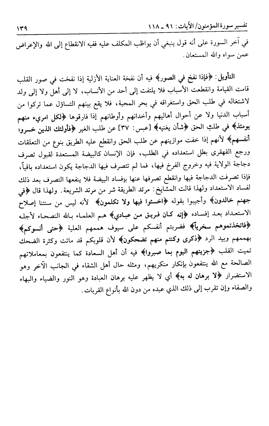 في طلب الحق شَأْنٌ يُغْنِيهِ [عبس: 37] عن طلب الغير فَأُولئِكَ الَّذِينَ خَسِرُوا أَنْفُسَهُمْ لأنهم إذا خفت موازينهم عن طلب الحق وانقطع عليه الطريق بنوع من التعلقات ورجع القهقرى بطل استعداده في الطلب، فإن الإنسان كالبيضة المستعدة لقبول تصرف دجاجة الولاية فيه وخروج الفرخ فيها، فما لم تتصرف فيها الدجاجة يكون استعداده باقيا، فإذا تصرفت الدجاجة فيها وانقطع تصرفها عنها بإفساد البيضة فلا ينفعها التصرف بعد ذلك لفساد الاستعداد ولهذا قالت المشايخ: مرتد الطريقة شر من مرتد الشريعة. ولهذا قال فِي جَهَنَّمَ خالِدُونَ وأجيبوا بقوله اخْسَؤُا فِيها وَلا تُكَلِّمُونِ لأنه ليس من سنتنا إصلاح الاستعداد بعد إفساده إِنَّهُ كانَ فَرِيقٌ مِنْ عِبادِي هم العلماء بالله النصحاء لأجله فَاتَّخَذْتُمُوهُمْ سِخْرِيًّا فضربتم أنفسكم على سيوف هممهم العلية حَتَّى أَنْسَوْكُمْ بهممهم وبيد الرد ذِكْرِي وَكُنْتُمْ مِنْهُمْ تَضْحَكُونَ لأن قلوبكم قد ماتت وكثرة الضحك تميت القلب جَزَيْتُهُمُ الْيَوْمَ بِما صَبَرُوا فيه أن أهل السعادة كما ينتفعون بمعاملاتهم الصالحة مع الله ينتفعون بإنكار منكريهم، ومثله حال أهل الشقاء في الجانب الآخر وهو الاستضرار لا بُرْهانَ لَهُ بِهِ أي لا يظهر عليه برهان العبادة وهو النور والضياء والبهاء والصفاء وإن تقرب إلى ذلك الذي عبده من دون الله بأنواع القربات.