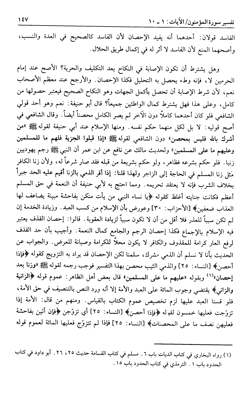 وهل يشترط أن تكون الإصابة في النكاح بعد التكليف والحرية؟ الأصح عند إمام الحرمين لا، فإنه وطء يحصل به التحليل فكذا الإحصان. والأرجح عند معظم الأصحاب نعم، لأن شرط الإصابة أن تحصل بأكمل الجهات وهو النكاح الصحيح فيعتبر حصولها من كامل، وعلى هذا فهل يشترط كمال الواطئين جميعا؟ قال أبو حنيفة: نعم وهو أحد قولي الشافعي فلو كان أحدهما كاملا دون الآخر لم يصر الكامل محصنا أيضا. وقال الشافعي في أصح قوليه: لا بل لكل منهما حكم نفسه. ومنها الإسلام عند أبي حنيفة