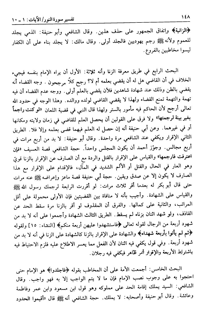 البحث الخامس: أجمعت الأمة على أن المخاطب بقوله فَاجْلِدُوا هو الإمام حتى احتجوا به على وجوب نصب الإمام فإن ما لا يتم الواجب إلا به فهو واجب. وقال الشافعي: السيد يملك إقامة الحد على مملوكه وهو قول ابن مسعود وابن عمر وفاطمة وعائشة. وقال أبو حنيفة وأصحابه: لا يملك. حجة الشافعي