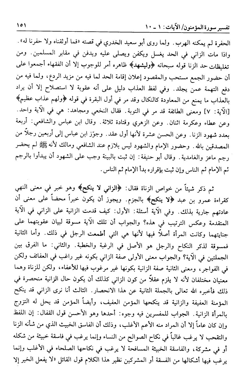 ثم ذكر شيئا من خواص الزناة فقال: الزَّانِي لا يَنْكِحُ وهو خبر في معنى النهي كقراءة عمرو بن عبد لا يَنْكِحُ بالجزم. ويجوز أن يكون خبرا محضا على معنى أن عادتهم جارية بذلك. وفي الآية أسئلة: الأول: كيف قدمت الزانية على الزاني في الآية المتقدمة وعكس الترتيب في هذه؟ والجواب أن تلك الآية مسوقة لبيان عقوبتهما على جنايتهما وكانت المرأة أصلا فيها لأنها هي التي أطمعت الرجل في ذلك. وأما الثانية فمسوقة لذكر النكاح والرجل هو الأصل في الرغبة والخطبة. والثاني: ما الفرق بين الجملتين في الآية؟ والجواب معنى الأولى صفة الزاني بكونه غير راغب في العفائف ولكن في الفواجر، ومعنى الثانية صفة الزانية بكونها غير مرغوب فيها للأعفاء، ولكن للزناة وهما معنيان مختلفان لأنه لا يلزم عقلا من كون الزاني كذلك أن يكون حال الزانية منحصرة في ذلك فأخبره الله تعالى بالجملة الثانية عن هذا الانحصار. الثالث أنا نرى الزاني قد ينكح المؤمنة العفيفة والزانية قد ينكحها المؤمن العفيف، وأيضا المؤمن قد يحل له التزوج بالمرأة الزانية. الجواب للمفسرين فيه وجوه: أحدها وهو الأحسن قول القفال: إن اللفظ وإن كان عاما إلا أن المراد منه الأعم الأغلب، وذلك أن الفاسق الخبيث الذي من شأنه الزنا والتقحب لا يرغب غالبا في نكاح الصوالح من النساء وإنما يرغب في فاسقة خبيثة من شكله أو في مشركة، والفاسقة الخبيثة المسافحة لا يرغب في نكاحها الصلحاء في الأغلب وإنما يرغب فيها أشكالها من الفسقة أو المشركين نظير هذا الكلام قول القائل «لا يفعل الخير إلا