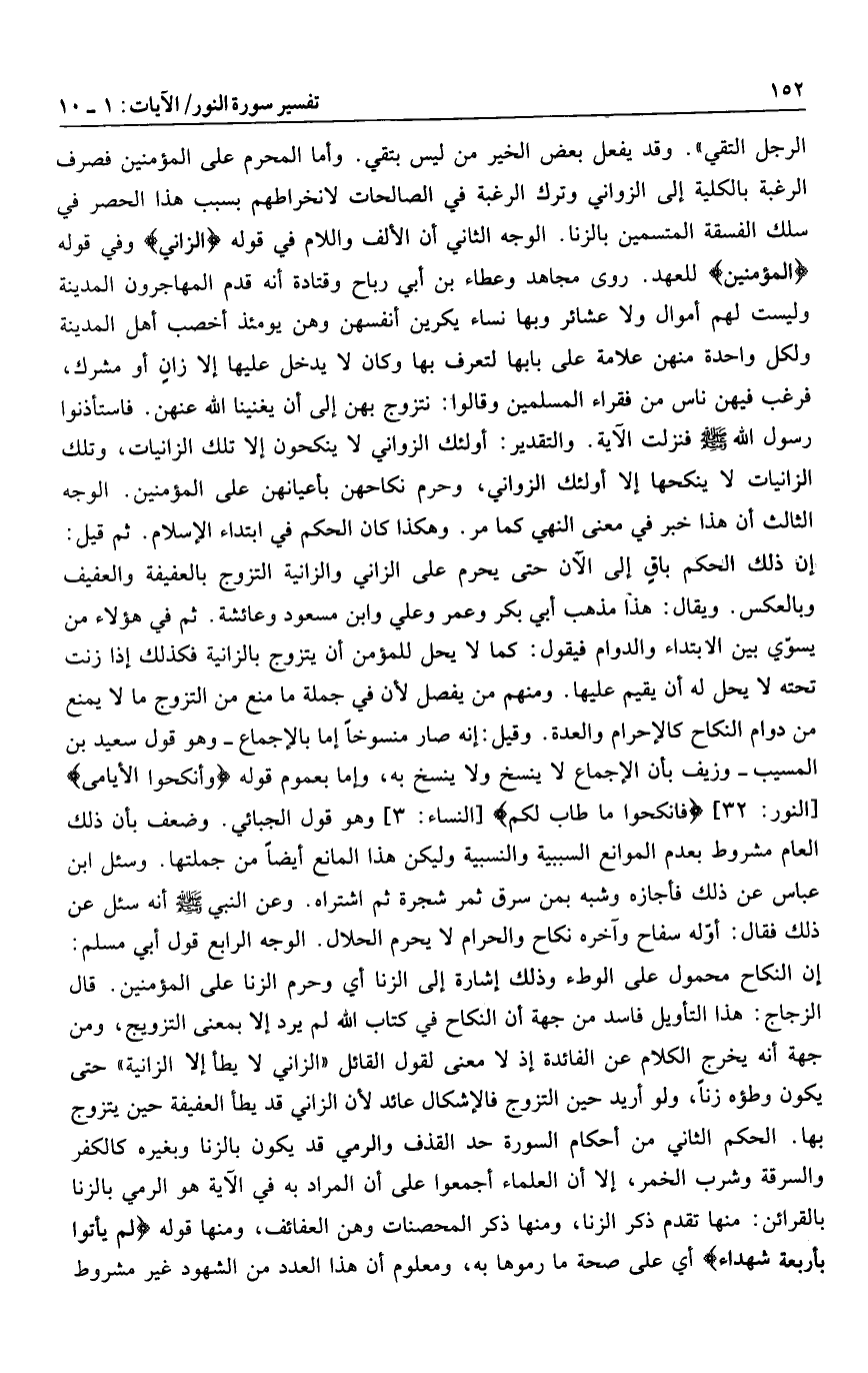 الرجل التقي» . وقد يفعل بعض الخير من ليس بتقي. وأما المحرم على المؤمنين فصرف الرغبة بالكلية إلى الزواني وترك الرغبة في الصالحات لانخراطهم بسبب هذا الحصر في سلك الفسقة المتسمين بالزنا. الوجه الثاني أن الألف واللام في قوله الزَّانِي وفي قوله الْمُؤْمِنِينَ للعهد.