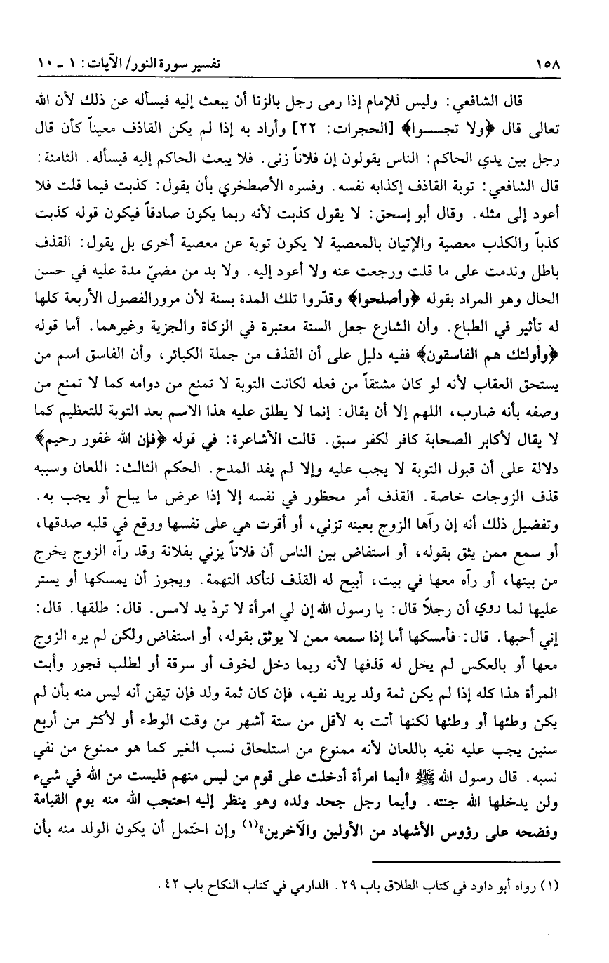 قال الشافعي: توبة القاذف إكذابه نفسه. وفسره الأصطخري بأن يقول: كذبت فيما قلت فلا أعود إلى مثله. وقال أبو إسحق: لا يقول كذبت لأنه ربما يكون صادقا فيكون قوله كذبت كذبا والكذب معصية والإتيان بالمعصية لا يكون توبة عن معصية أخرى بل يقول: القذف باطل وندمت على ما قلت ورجعت عنه ولا أعود إليه. ولا بد من مضيّ مدة عليه في حسن الحال وهو المراد بقوله وَأَصْلَحُوا وقدّروا تلك المدة بسنة لأن مرور الفصول الأربعة كلها له تأثير في الطباع. وأن الشارع جعل السنة معتبرة في الزكاة والجزية وغيرهما. أما قوله وَأُولئِكَ هُمُ الْفاسِقُونَ ففيه دليل على أن القذف من جملة الكبائر، وأن الفاسق اسم من يستحق العقاب لأنه لو كان مشتقا من فعله لكانت التوبة لا تمنع من دوامه كما لا تمنع من وصفه بأنه ضارب، اللهم إلا أن يقال: إنما لا يطلق عليه هذا الاسم بعد التوبة للتعظيم كما لا يقال لأكابر الصحابة كافر لكفر سبق. قالت الأشاعرة: في قوله فَإِنَّ اللَّهَ غَفُورٌ رَحِيمٌ دلالة على أن قبول التوبة لا يجب عليه وإلا لم يفد المدح. الحكم الثالث: اللعان وسببه قذف الزوجات خاصة. القذف أمر محظور في نفسه إلا إذا عرض ما يباح أو يجب به.