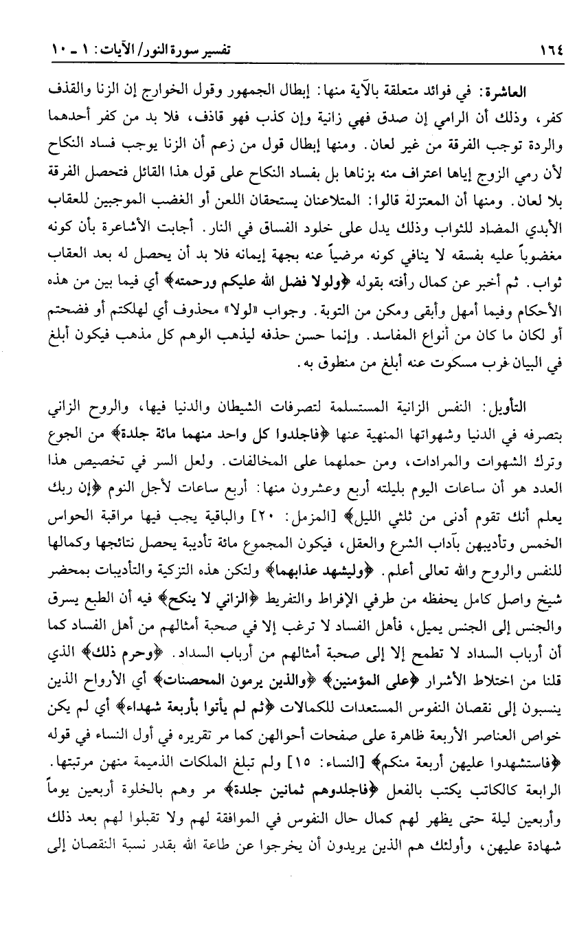 النفس الزانية المستسلمة لتصرفات الشيطان والدنيا فيها، والروح الزاني بتصرفه في الدنيا وشهواتها المنهية عنها فَاجْلِدُوا كُلَّ واحِدٍ مِنْهُما مِائَةَ جَلْدَةٍ من الجوع وترك الشهوات والمرادات، ومن حملهما على المخالفات. ولعل السر في تخصيص هذا العدد هو أن ساعات اليوم بليلته أربع وعشرون منها: أربع ساعات لأجل النوم إِنَّ رَبَّكَ يَعْلَمُ أَنَّكَ تَقُومُ أَدْنى مِنْ ثُلُثَيِ اللَّيْلِ [المزمل: 20] والباقية يجب فيها مراقبة الحواس الخمس وتأديبهن بآداب الشرع والعقل، فيكون المجموع مائة تأديبة يحصل نتائجها وكمالها للنفس والروح والله تعالى أعلم. وَلْيَشْهَدْ عَذابَهُما ولتكن هذه التزكية والتأديبات بمحضر شيخ واصل كامل يحفظه من طرفي الإفراط والتفريط الزَّانِي لا يَنْكِحُ فيه أن الطبع يسرق والجنس إلى الجنس يميل، فأهل الفساد لا ترغب إلا في صحبة أمثالهم من أهل الفساد كما أن أرباب السداد لا تطمح إلا إلى صحبة أمثالهم من أرباب السداد. وَحُرِّمَ ذلِكَ الذي قلنا من اختلاط الأشرار عَلَى الْمُؤْمِنِينَ وَالَّذِينَ يَرْمُونَ الْمُحْصَناتِ أي الأرواح الذين ينسبون إلى نقصان النفوس المستعدات للكمالات ثُمَّ لَمْ يَأْتُوا بِأَرْبَعَةِ شُهَداءَ أي لم يكن خواص العناصر الأربعة ظاهرة على صفحات أحوالهن كما مر تقريره في أول النساء في قوله فَاسْتَشْهِدُوا عَلَيْهِنَّ أَرْبَعَةً مِنْكُمْ [النساء: 15] ولم تبلغ الملكات الذميمة منهن مرتبتها.