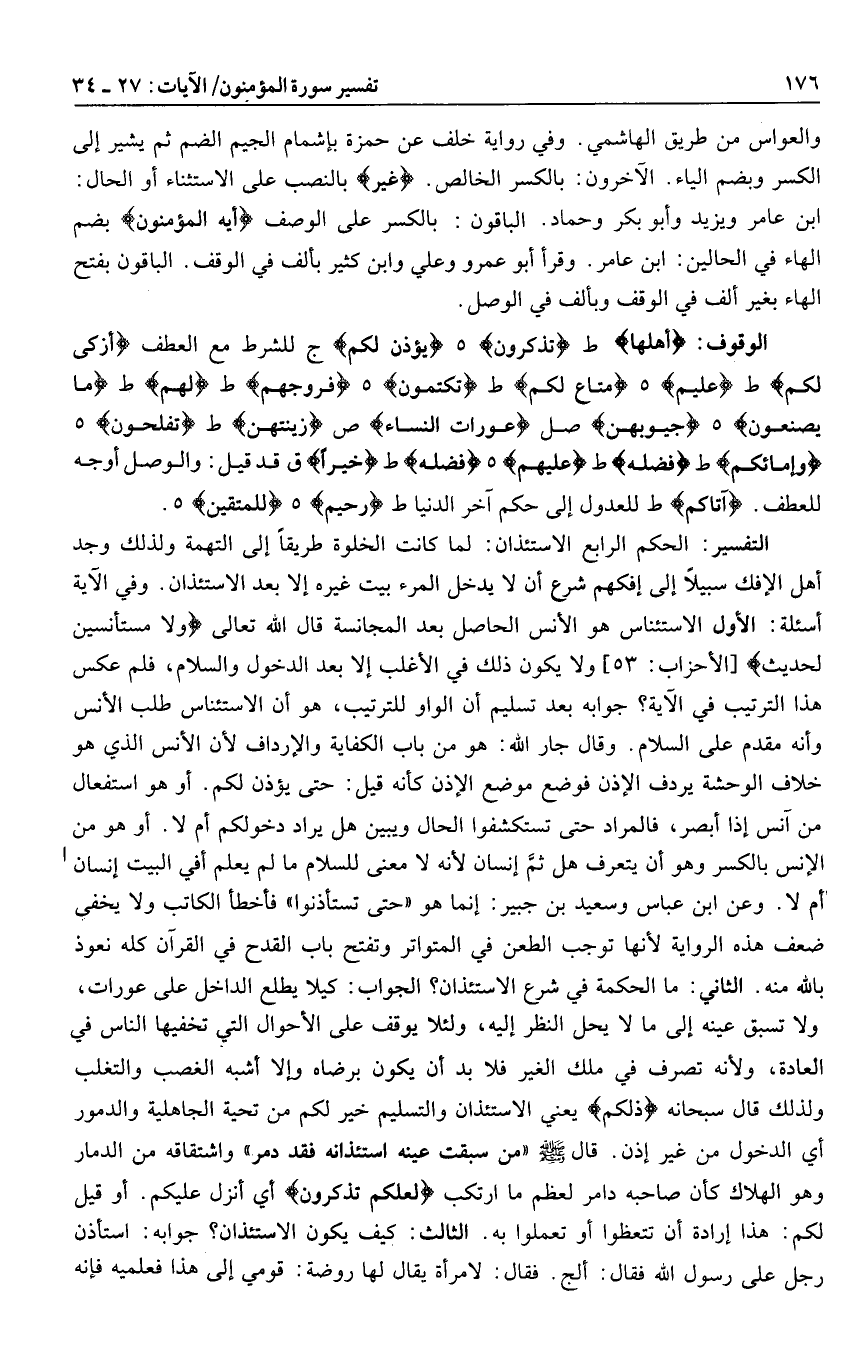 أَهْلِها ط تَذَكَّرُونَ هـ يُؤْذَنَ لَكُمْ ج للشرط مع العطف أَزْكى لَكُمْ ط عَلِيمٌ هـ مَتاعٌ لَكُمْ ط تَكْتُمُونَ هـ فُرُوجَهُمْ ط لَهُمْ ط بِما يَصْنَعُونَ هـ جُيُوبِهِنَّ صل عَوْراتِ النِّساءِ ص زِينَتَهُنَّ ط تُفْلِحُونَ هـ وَإِمائِكُمْ ط فَضْلِهِ ط عَلِيمٌ هـ فَضْلِهِ ط خَيْراً ق قد قيل: والوصل أوجه للعطف. آتاكُمْ ط للعدول إلى حكم آخر الدنيا ط رَحِيمٌ هـ لِلْمُتَّقِينَ هـ.