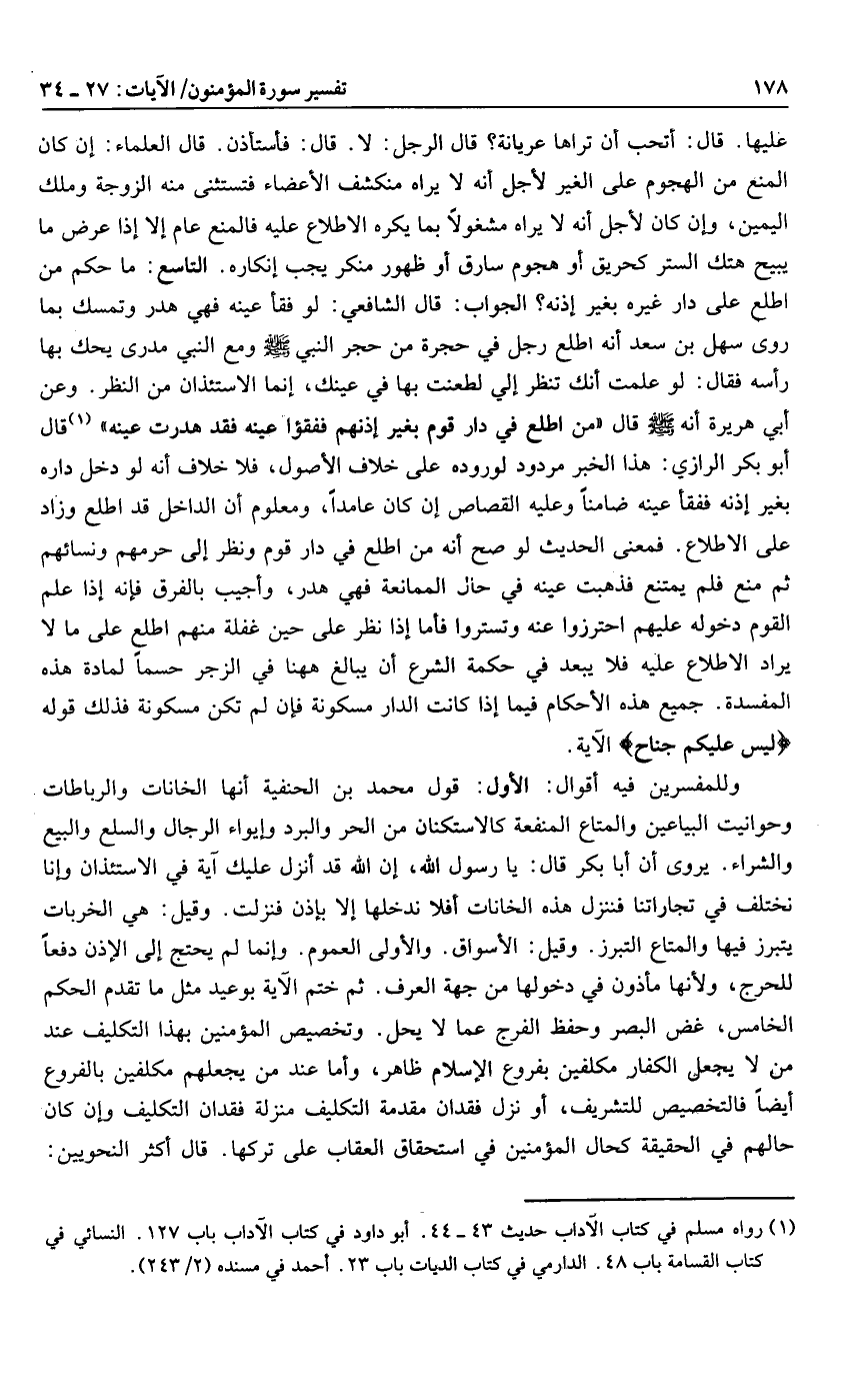 قال أبو بكر الرازي: هذا الخبر مردود لوروده على خلاف الأصول، فلا خلاف أنه لو دخل داره بغير إذنه ففقأ عينه ضامنا وعليه القصاص إن كان عامدا، ومعلوم أن الداخل قد اطلع وزاد على الاطلاع. فمعنى الحديث لو صح أنه من اطلع في دار قوم ونظر إلى حرمهم ونسائهم ثم منع فلم يمتنع فذهبت عينه في حال الممانعة فهي هدر، وأجيب بالفرق فإنه إذا علم القوم دخوله عليهم احترزوا عنه وتستروا فأما إذا نظر على حين غفلة منهم اطلع على ما لا يراد الاطلاع عليه فلا يبعد في حكمة الشرع أن يبالغ هاهنا في الزجر حسما لمادة هذه المفسدة. جميع هذه الأحكام فيما إذا كانت الدار مسكونة فإن لم تكن مسكونة فذلك قوله لَيْسَ عَلَيْكُمْ جُناحٌ الآية.