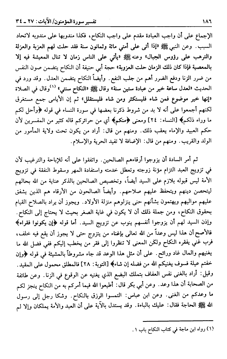 ثم أمر السادة أن يزوجوا أرقاءهم الصالحين. واتفقوا على أنه للإباحة والترغيب لأن في تزويج العبد التزام مؤنة زوجته وتعطل خدمته واستفادة المهر وسقوط النفقة في تزويج الأمة ليس قبوله بلازم على السيد أيضا، وتخصيص الصالحين بالذكر عناية من الله بحالهم ليتحصن دينهم ويتحفظ عليهم صلاحهم. وأيضا الصالحون من الأرقاء هم الذين يشفق عليهم مواليهم ويهتمون بشأنهم حتى ينزلوهم منزلة الأولاد. ويجوز أن يراد بالصلاح القيام بحقوق النكاح، ومن جملة ذلك أن لا يكون في غاية الصغر بحيث لا يحتاج إلى النكاح.