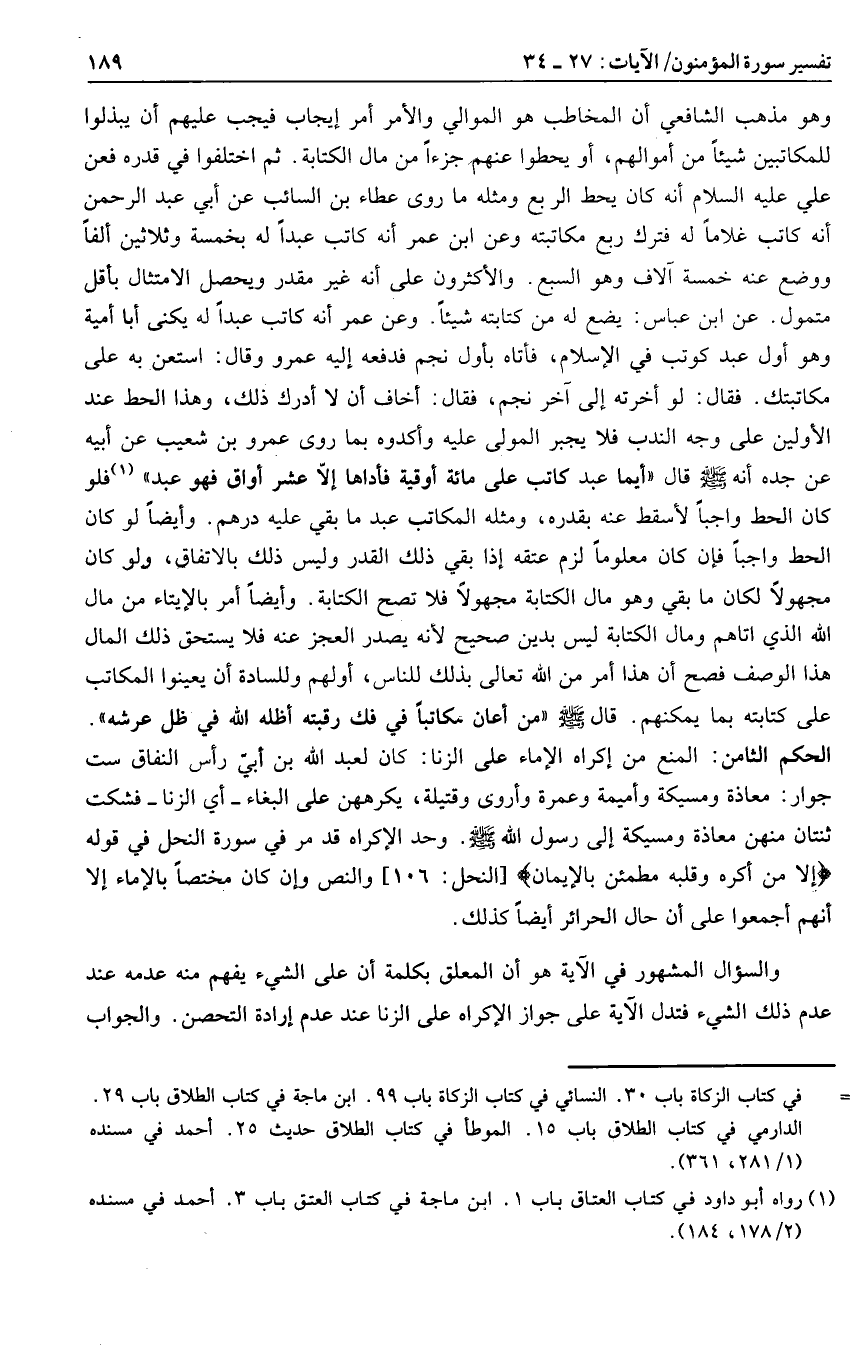 والسؤال المشهور في الآية هو أن المعلق بكلمة أن على الشيء يفهم منه عدمه عند عدم ذلك الشيء فتدل الآية على جواز الإكراه على الزنا عند عدم إرادة التحصن. والجواب