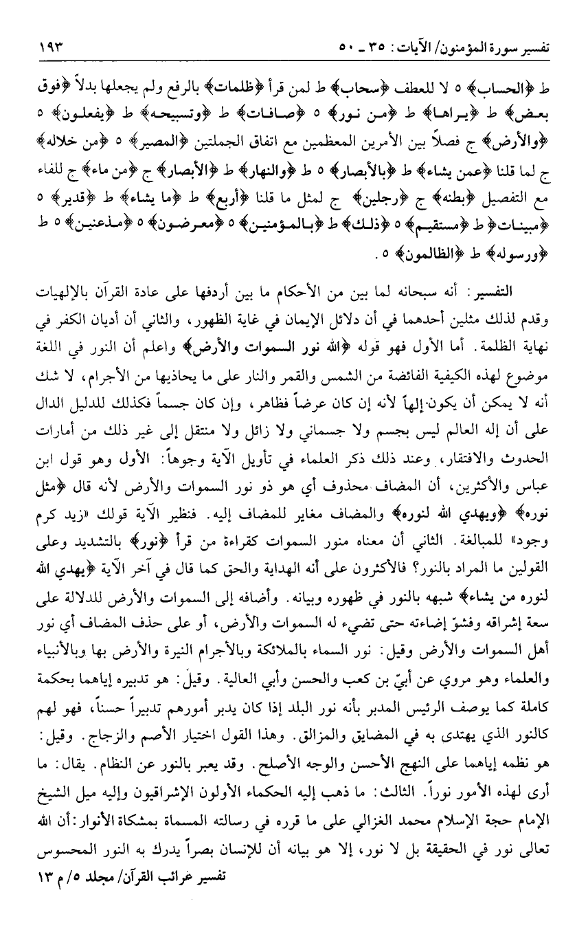 هو نظمه إياهما على النهج الأحسن والوجه الأصلح. وقد يعبر بالنور عن النظام. يقال: ما أرى لهذه الأمور نورا. الثالث: ما ذهب إليه الحكماء الأولون الإشراقيون وإليه ميل الشيخ الإمام حجة الإسلام محمد الغزالي على ما قرره في رسالته المسماة بمشكاة الأنوار: أن الله تعالى نور في الحقيقة بل لا نور، إلا هو بيانه أن للإنسان بصرا يدرك به النور المحسوس