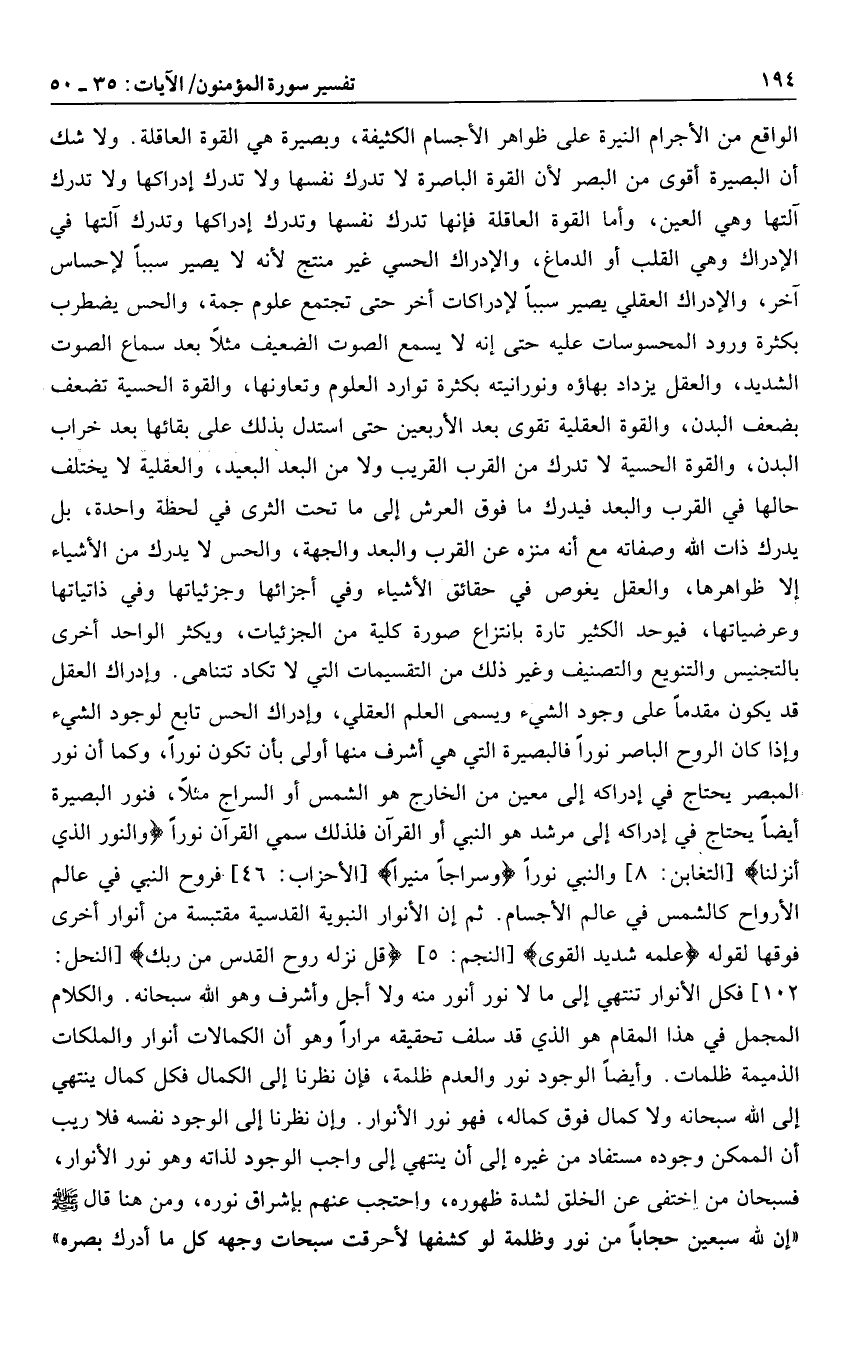 الواقع من الأجرام النيرة على ظواهر الأجسام الكثيفة، وبصيرة هي القوة العاقلة. ولا شك أن البصيرة أقوى من البصر لأن القوة الباصرة لا تدرك نفسها ولا تدرك إدراكها ولا تدرك آلتها وهي العين، وأما القوة العاقلة فإنها تدرك نفسها وتدرك إدراكها وتدرك آلتها في الإدراك وهي القلب أو الدماغ، والإدراك الحسي غير منتج لأنه لا يصير سببا لإحساس آخر، والإدراك العقلي يصير سببا لإدراكات أخر حتى تجتمع علوم جمة، والحس يضطرب بكثرة ورود المحسوسات عليه حتى إنه لا يسمع الصوت الضعيف مثلا بعد سماع الصوت الشديد، والعقل يزداد بهاؤه ونورانيته بكثرة توارد العلوم وتعاونها، والقوة الحسية تضعف بضعف البدن، والقوة العقلية تقوى بعد الأربعين حتى استدل بذلك على بقائها بعد خراب البدن، والقوة الحسية لا تدرك من القرب القريب ولا من البعد البعيد، والعقلية لا يختلف حالها في القرب والبعد فيدرك ما فوق العرش إلى ما تحت الثرى في لحظة واحدة، بل يدرك ذات الله وصفاته مع أنه منزه عن القرب والبعد والجهة، والحس لا يدرك من الأشياء إلا ظواهرها، والعقل يغوص في حقائق الأشياء وفي أجزائها وجزئياتها وفي ذاتياتها وعرضياتها، فيوحد الكثير تارة بانتزاع صورة كلية من الجزئيات، ويكثر الواحد أخرى بالتجنيس والتنويع والتصنيف وغير ذلك من التقسيمات التي لا تكاد تتناهى. وإدراك العقل قد يكون مقدما على وجود الشيء ويسمى العلم العقلي، وإدراك الحس تابع لوجود الشيء وإذا كان الروح الباصر نورا فالبصيرة التي هي أشرف منها أولى بأن تكون نورا، وكما أن نور المبصر يحتاج في إدراكه إلى معين من الخارج هو الشمس أو السراج مثلا، فنور البصيرة أيضا يحتاج في إدراكه إلى مرشد هو النبي أو القرآن فلذلك سمي القرآن نورا وَالنُّورِ الَّذِي أَنْزَلْنا [التغابن: 8] والنبي نورا وَسِراجاً مُنِيراً [الأحزاب: 46] فروح النبي في عالم الأرواح كالشمس في عالم الأجسام. ثم إن الأنوار النبوية القدسية مقتبسة من أنوار أخرى فوقها لقوله عَلَّمَهُ شَدِيدُ الْقُوى [النجم: 5] قُلْ نَزَّلَهُ رُوحُ الْقُدُسِ مِنْ رَبِّكَ [النحل: