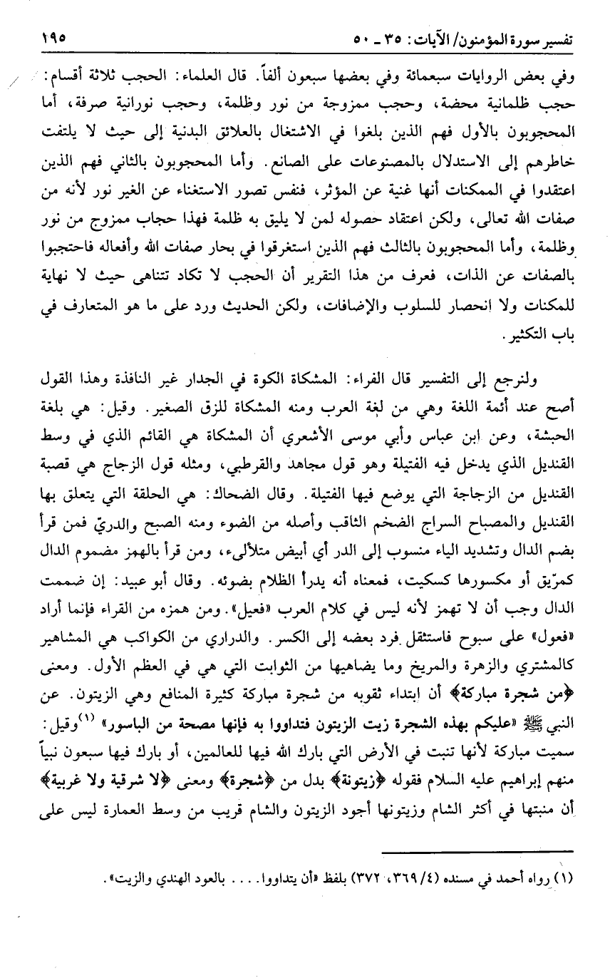 ولنرجع إلى التفسير قال الفراء: المشكاة الكوة في الجدار غير النافذة وهذا القول أصح عند أئمة اللغة وهي من لغة العرب ومنه المشكاة للزق الصغير. وقيل: هي بلغة الحبشة، وعن ابن عباس وأبي موسى الأشعري أن المشكاة هي القائم الذي في وسط القنديل الذي يدخل فيه الفتيلة وهو قول مجاهد والقرطبي، ومثله قول الزجاج هي قصبة القنديل من الزجاجة التي يوضع فيها الفتيلة. وقال الضحاك: هي الحلقة التي يتعلق بها القنديل والمصباح السراج الضخم الثاقب وأصله من الضوء ومنه الصبح والدريّ فمن قرأ بضم الدال وتشديد الياء منسوب إلى الدر أي أبيض متلألىء، ومن قرأ بالهمز مضموم الدال كمرّيق أو مكسورها كسكيت، فمعناه أنه يدرأ الظلام بضوئه. وقال أبو عبيد: إن ضممت الدال وجب أن لا تهمز لأنه ليس في كلام العرب «فعيل» . ومن همزه من القراء فإنما أراد «فعول» على سبوح فاستثقل فرد بعضه إلى الكسر. والدراري من الكواكب هي المشاهير كالمشتري والزهرة والمريخ وما يضاهيها من الثوابت التي هي في العظم الأول. ومعنى مِنْ شَجَرَةٍ مُبارَكَةٍ أن ابتداء ثقوبه من شجرة مباركة كثيرة المنافع وهي الزيتون.