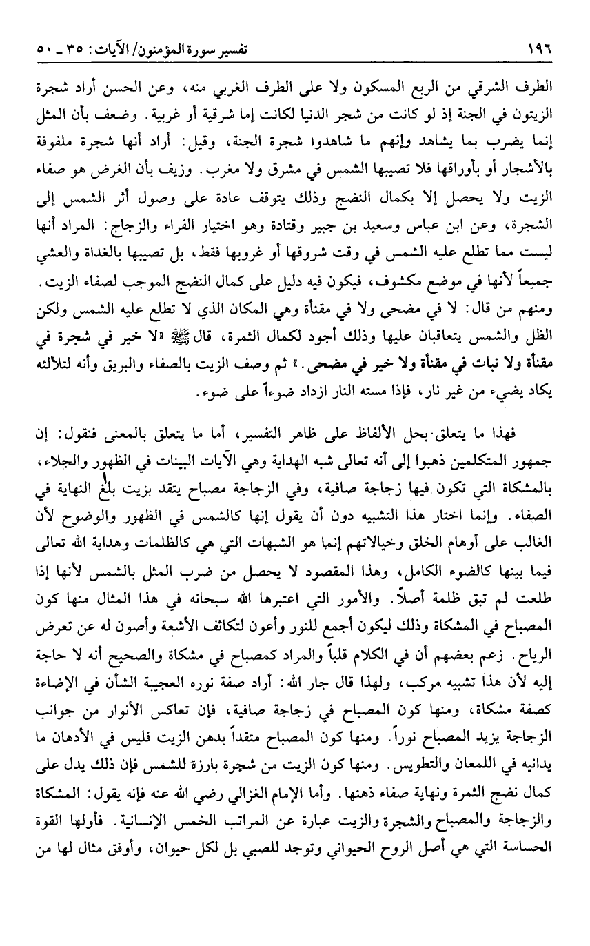فهذا ما يتعلق بحل الألفاظ على ظاهر التفسير، أما ما يتعلق بالمعنى فنقول: إن جمهور المتكلمين ذهبوا إلى أنه تعالى شبه الهداية وهي الآيات البينات في الظهور والجلاء، بالمشكاة التي تكون فيها زجاجة صافية، وفي الزجاجة مصباح يتقد بزيت بلغ النهاية في الصفاء. وإنما اختار هذا التشبيه دون أن يقول إنها كالشمس في الظهور والوضوح لأن الغالب على أوهام الخلق وخيالاتهم إنما هو الشبهات التي هي كالظلمات وهداية الله تعالى فيما بينها كالضوء الكامل، وهذا المقصود لا يحصل من ضرب المثل بالشمس لأنها إذا طلعت لم تبق ظلمة أصلا. والأمور التي اعتبرها الله سبحانه في هذا المثال منها كون المصباح في المشكاة وذلك ليكون أجمع للنور وأعون لتكاثف الأشعة وأصون له عن تعرض الرياح. زعم بعضهم أن في الكلام قلبا والمراد كمصباح في مشكاة والصحيح أنه لا حاجة إليه لأن هذا تشبيه مركب، ولهذا قال جار الله: أراد صفة نوره العجيبة الشأن في الإضاءة كصفة مشكاة، ومنها كون المصباح في زجاجة صافية، فإن تعاكس الأنوار من جوانب الزجاجة يزيد المصباح نورا. ومنها كون المصباح متقدا بدهن الزيت فليس في الأدهان ما يدانيه في اللمعان والتطويس. ومنها كون الزيت من شجرة بارزة للشمس فإن ذلك يدل على كمال نضج الثمرة ونهاية صفاء ذهنها. وأما الإمام الغزالي رضي الله عنه فإنه يقول: المشكاة والزجاجة والمصباح والشجرة والزيت عبارة عن المراتب الخمس الإنسانية. فأولها القوة الحساسة التي هي أصل الروح الحيواني وتوجد للصبي بل لكل حيوان، وأوفق مثال لها من