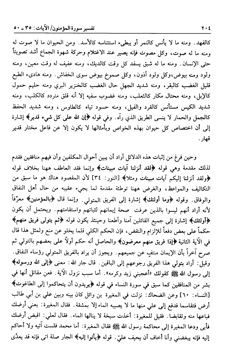 كالفهد. ومنه ما لا يأنس كالنمر أو يبطىء استئناسه كالأسد. ومن الحيوان ما لا صوت له ومنه ما له صوت، وكل مصوت فإنه يصير عند الاغتلام وحركة شهوة الجماع أشد تصويتا حتى الإنسان. ومنه ما له شبق يسفد كل وقت كالديك، ومنه عفيف له وقت معين، ومنه ولود ومنه بيوض، وكل ولود أذون، وكل صموخ بيوض سوى الخفاش. ومنه هادىء الطبع قليل الغضب كالبقر، ومنه شديد الجهل حال الغضب كالخنزير البري ومنه حليم حمول كالإبل، ومنه محتال مكار كالثعلب، ومنه غضوب سفيه إلا أنه قلق متردد كالكلب، ومنه شديد الكيس مستأنس كالقرد والفيل، ومنه حسود تياه كالطاوس، ومنه شديد الحفظ كالجمل والحمار لا ينسى الطريق الذي رآه. وفي قوله إِنَّ اللَّهَ عَلى كُلِّ شَيْءٍ قَدِيرٌ إشارة إلى أن اختصاص كل حيوان بهذه الخواص وبأمثالها لا يكون إلا عن فاعل مختار قدير قهار.
