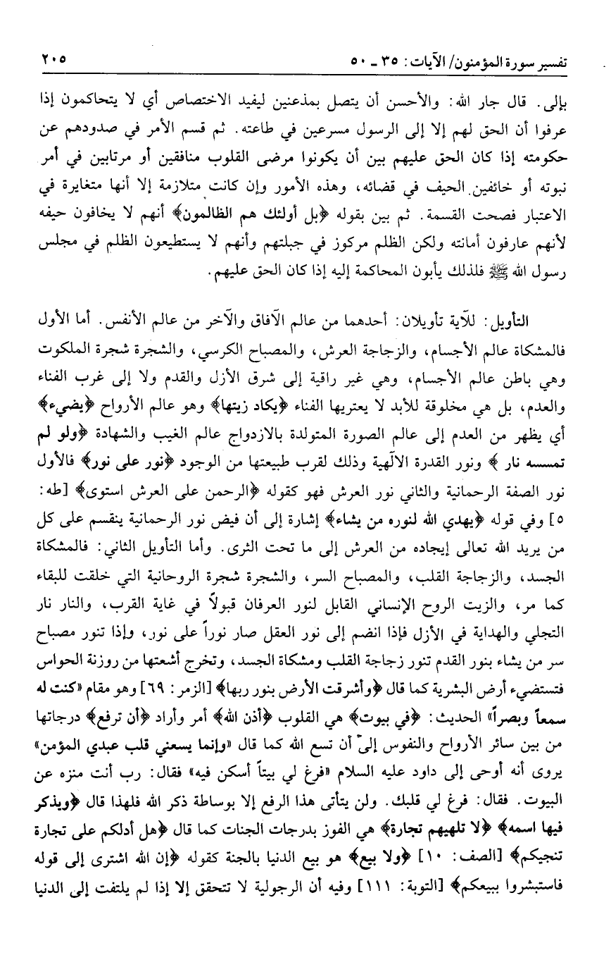 للآية تأويلان: أحدهما من عالم الآفاق والآخر من عالم الأنفس. أما الأول فالمشكاة عالم الأجسام، والزجاجة العرش، والمصباح الكرسي، والشجرة شجرة الملكوت وهي باطن عالم الأجسام، وهي غير راقية إلى شرق الأزل والقدم ولا إلى غرب الفناء والعدم، بل هي مخلوقة للأبد لا يعتريها الفناء يَكادُ زَيْتُها وهو عالم الأرواح يُضِيءُ أي يظهر من العدم إلى عالم الصورة المتولدة بالازدواج عالم الغيب والشهادة وَلَوْ لَمْ تَمْسَسْهُ نارٌ ونور القدرة الالهية وذلك لقرب طبيعتها من الوجود نُورٌ عَلى نُورٍ فالأول نور الصفة الرحمانية والثاني نور العرش فهو كقوله الرَّحْمنُ عَلَى الْعَرْشِ اسْتَوى [طه: