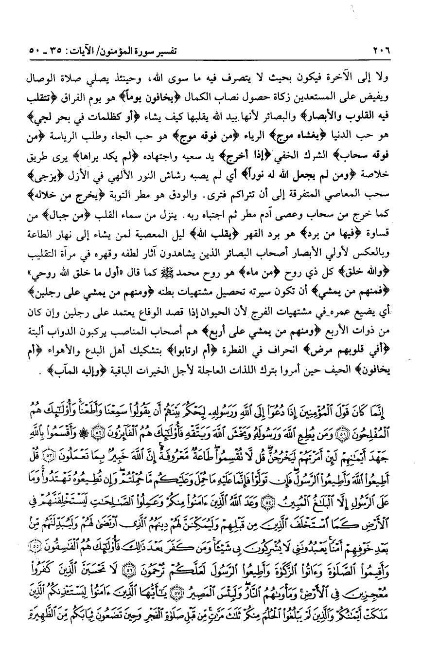 فَمِنْهُمْ مَنْ يَمْشِي أن تكون سيرته تحصيل مشتهيات بطنه وَمِنْهُمْ مَنْ يَمْشِي عَلى رِجْلَيْنِ أي يضيع عمره في مشتهيات الفرج لأن الحيوان إذا قصد الوقاع يعتمد على رجلين وإن كان من ذوات الأربع وَمِنْهُمْ مَنْ يَمْشِي عَلى أَرْبَعٍ هم أصحاب المناصب يركبون الدواب البتة أَفِي قُلُوبِهِمْ مَرَضٌ انحراف في الفطرة أَمِ ارْتابُوا بتشكيك أهل البدع والأهواء أَمْ يَخافُونَ الحيف حين أمروا بترك اللذات العاجلة لأجل الخيرات الباقية وَإِلَيْهِ مَآبِ.