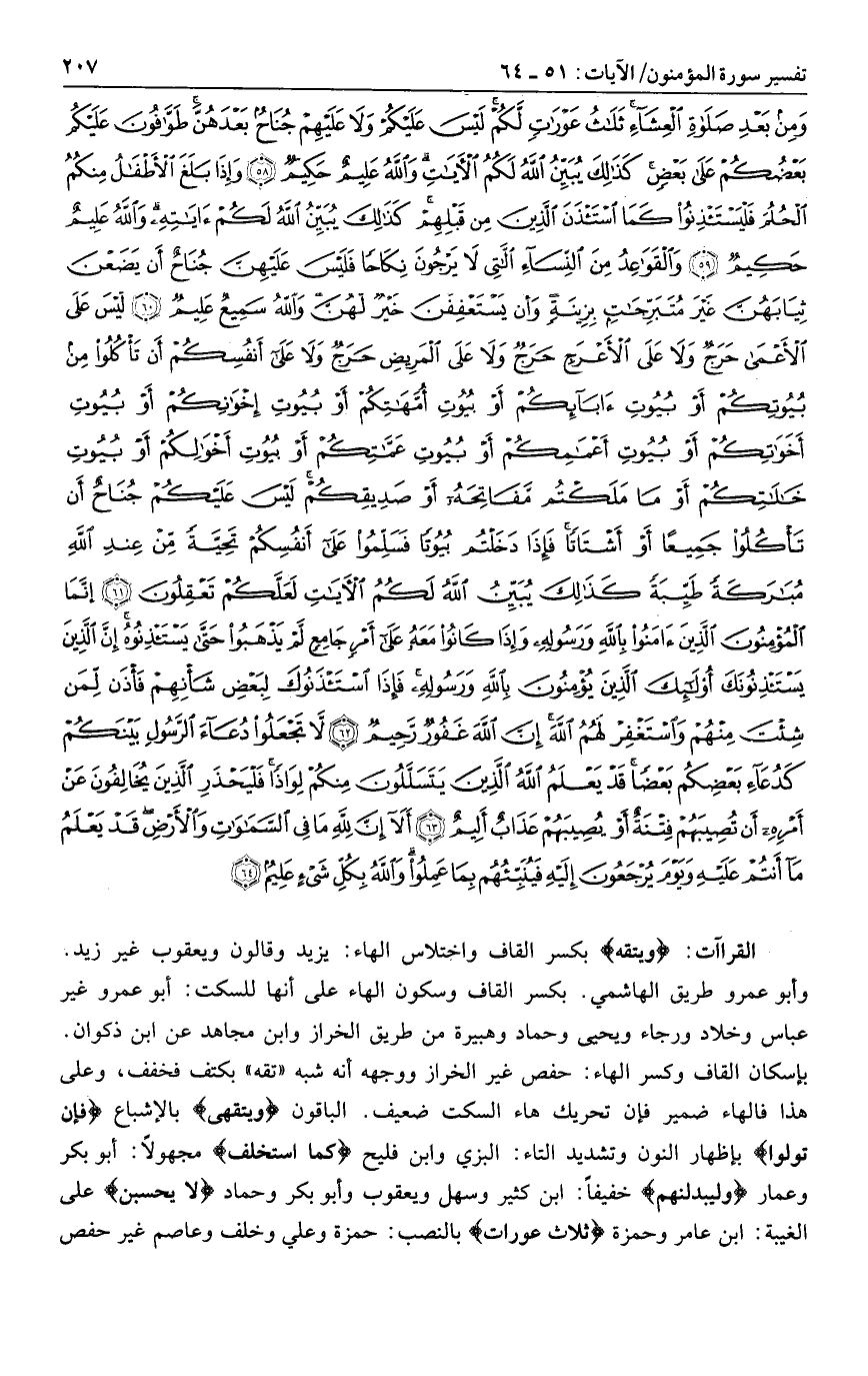 بإسكان القاف وكسر الهاء: حفص غير الخراز ووجهه أنه شبه «تقه» بكتف فخفف، وعلى هذا فالهاء ضمير فإن تحريك هاء السكت ضعيف. الباقون ويتقهى بالإشباع فَإِنْ تَوَلَّوْا بإظهار النون وتشديد التاء: البزي وابن فليح كما استخلف مجهولا: أبو بكر وعمار وليبدلنهم خفيفا: ابن كثير وسهل ويعقوب وأبو بكر وحماد لا يحسبن على الغيبة: ابن عامر وحمزة ثلاث عورات بالنصب: حمزة وعلي وخلف وعاصم غير حفص