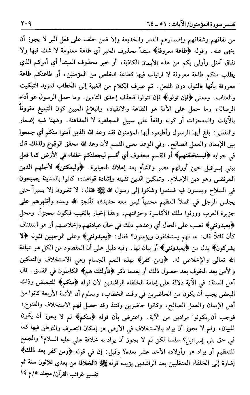 فأنجز الله وعده وأظهرهم على جزيرة العرب وورثوا ملك الأكاسرة وخزائنهم، وهذا إخبار بالغيب فيكون معجزا. ومحل يَعْبُدُونَنِي نصب على الحال أي وعدهم ذلك في حال عبادتهم وإخلاصهم أو هو استئناف كأن قائلا قال: ما لهم يستخلفون ويؤمنون؟ فقال: يَعْبُدُونَنِي وعلى الوجهين فقوله لا يُشْرِكُونَ بدل من يَعْبُدُونَنِي أو بيان لها. وفيه دليل على أن المقصود من الكل هو عبادة الله تعالى والإخلاص له. وَمَنْ كَفَرَ بهذه النعم الجسام وهي الاستخلاف والتمكين والأمن بعد الخوف بعد حصول ذلك أو بعد ما ذكر فَأُولئِكَ هُمُ الكاملون في الفسق. قال أهل السنة: في الآية دلالة على إمامة الخلفاء الراشدين لأن قوله مِنْكُمْ للتبعيض وذلك البعض يجب أن يكون من الحاضرين في وقت الخطاب، ومعلوم أن الأئمة الأربعة كانوا من أهل الإيمان والعمل الصالح، وكانوا حاضرين وقتئذ وقد حصل لهم الاستخلاف والفتوح، فوجب أن يكونوا مرادين من الآية. واعترض بأن قوله مِنْكُمْ لم لا يجوز أن يكون للبيان، ولم لا يجوز أن يراد بالاستخلاف في الأرض هو إمكان التصرف والتوطن فيها كما في حق بني إسرائيل؟ سلمنا لكن لم لا يجوز أن يراد به خلافة علي عليه السلام؟ والجمع للتعظيم أو يراد هو وأولاده الأحد عشر بعده؟ وقيل: إن في قوله وَمَنْ كَفَرَ بَعْدَ ذلِكَ إشارة إلى الخلفاء المتغلبين بعد الراشدين يؤيده قوله صلى الله عليه وسلم «الخلافة من بعدي ثلاثون سنة ثم