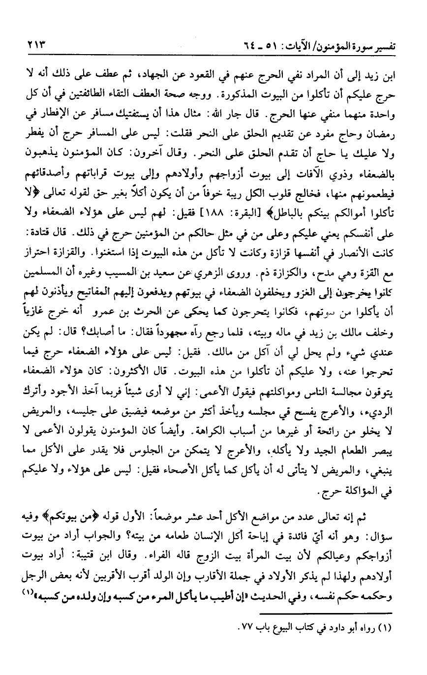 كانت الأنصار في أنفسها قزازة وكانت لا تأكل من هذه البيوت إذا استغنوا. والقزازة احتراز مع القزة وهي مدح، والكزازة ذم. وروى الزهري عن سعيد بن المسيب وغيره أن المسلمين كانوا يخرجون إلى الغزو ويخلفون الضعفاء في بيوتهم ويدفعون إليهم المفاتيح ويأذنون لهم أن يأكلوا من بيوتهم، فكانوا يتحرجون كما يحكى عن الحرث بن عمرو أنه خرج غازيا وخلف مالك بن زيد في ماله وبيته، فلما رجع رآه مجهودا فقال: ما أصابك؟ قال: لم يكن عندي شيء ولم يحل لي أن آكل من مالك. فقيل: ليس على هؤلاء الضعفاء حرج فيما تحرجوا عنه، ولا عليكم أن تأكلوا من هذه البيوت. قال الأكثرون: كان هؤلاء الضعفاء يتوقون مجالسة الناس ومواكلتهم فيقول الأعمى: إني لا أرى شيئا فربما آخذ الأجود وأترك الرديء، والأعرج يفسح في مجلسه ويأخذ أكثر من موضعه فيضيق على جليسه، والمريض لا يخلو من رائحة أو غيرها من أسباب الكراهة. وأيضا كان المؤمنون يقولون الأعمى لا يبصر الطعام الجيد ولا يأكله، والأعرج لا يتمكن من الجلوس فلا يقدر على الأكل مما ينبغي، والمريض لا يتأتى له أن يأكل كما يأكل الأصحاء فقيل: ليس على هؤلاء ولا عليكم في المؤاكلة حرج.