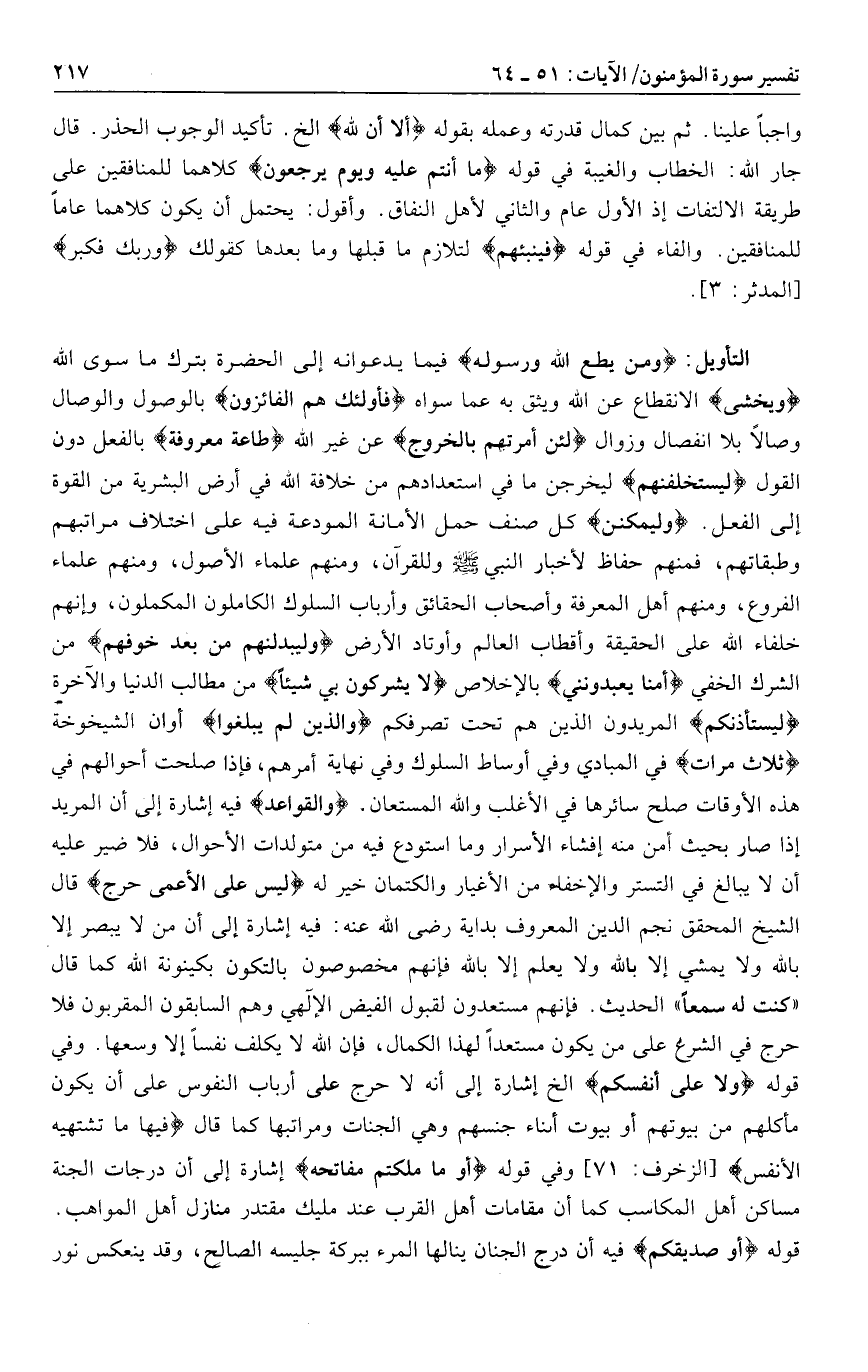 بالفعل دون القول لَيَسْتَخْلِفَنَّهُمْ ليخرجن ما في استعدادهم من خلافة الله في أرض البشرية من القوة إلى الفعل. وَلَيُمَكِّنَنَّ كل صنف حمل الأمانة المودعة فيه على اختلاف مراتبهم وطبقاتهم، فمنهم حفاظ لأخبار النبي صلى الله عليه وسلم وللقرآن، ومنهم علماء الأصول، ومنهم علماء الفروع، ومنهم أهل المعرفة وأصحاب الحقائق وأرباب السلوك الكاملون المكملون، وإنهم خلفاء الله على الحقيقة وأقطاب العالم وأوتاد الأرض وَلَيُبَدِّلَنَّهُمْ مِنْ بَعْدِ خَوْفِهِمْ من الشرك الخفي أَمْناً يَعْبُدُونَنِي بالإخلاص لا يُشْرِكُونَ بِي شَيْئاً من مطالب الدنيا والآخرة لِيَسْتَأْذِنْكُمُ المريدون الذين هم تحت تصرفكم وَالَّذِينَ لَمْ يَبْلُغُوا أوان الشيخوخة ثَلاثَ مَرَّاتٍ في المبادي وفي أوساط السلوك وفي نهاية أمرهم، فإذا صلحت أحوالهم في هذه الأوقات صلح سائرها في الأغلب والله المستعان. وَالْقَواعِدُ فيه إشارة إلى أن المريد إذا صار بحيث أمن منه إفشاء الأسرار وما استودع فيه من متولدات الأحوال، فلا ضير عليه أن لا يبالغ في التستر والإخفاء من الأغيار والكتمان خير له لَيْسَ عَلَى الْأَعْمى حَرَجٌ قال الشيخ المحقق نجم الدين المعروف بداية رضى الله عنه: فيه إشارة إلى أن من لا يبصر إلا بالله ولا يمشي إلا بالله ولا يعلم إلا بالله فإنهم مخصوصون بالتكون بكينونة الله كما قال «كنت له سمعا» الحديث. فإنهم مستعدون لقبول الفيض الإلهي وهم السابقون المقربون فلا حرج في الشرع على من يكون مستعدا لهذا الكمال، فإن الله لا يكلف نفسا إلا وسعها. وفي قوله وَلا عَلى أَنْفُسِكُمْ إلخ إشارة إلى أنه لا حرج على أرباب النفوس على أن يكون مأكلهم من بيوتهم أو بيوت أبناء جنسهم وهي الجنات ومراتبها كما قال فِيها ما تَشْتَهِيهِ الْأَنْفُسُ [الزخرف: 71] وفي قوله أَوْ ما مَلَكْتُمْ مَفاتِحَهُ إشارة إلى أن درجات الجنة مساكن أهل المكاسب كما أن مقامات أهل القرب عند مليك مقتدر منازل أهل المواهب.