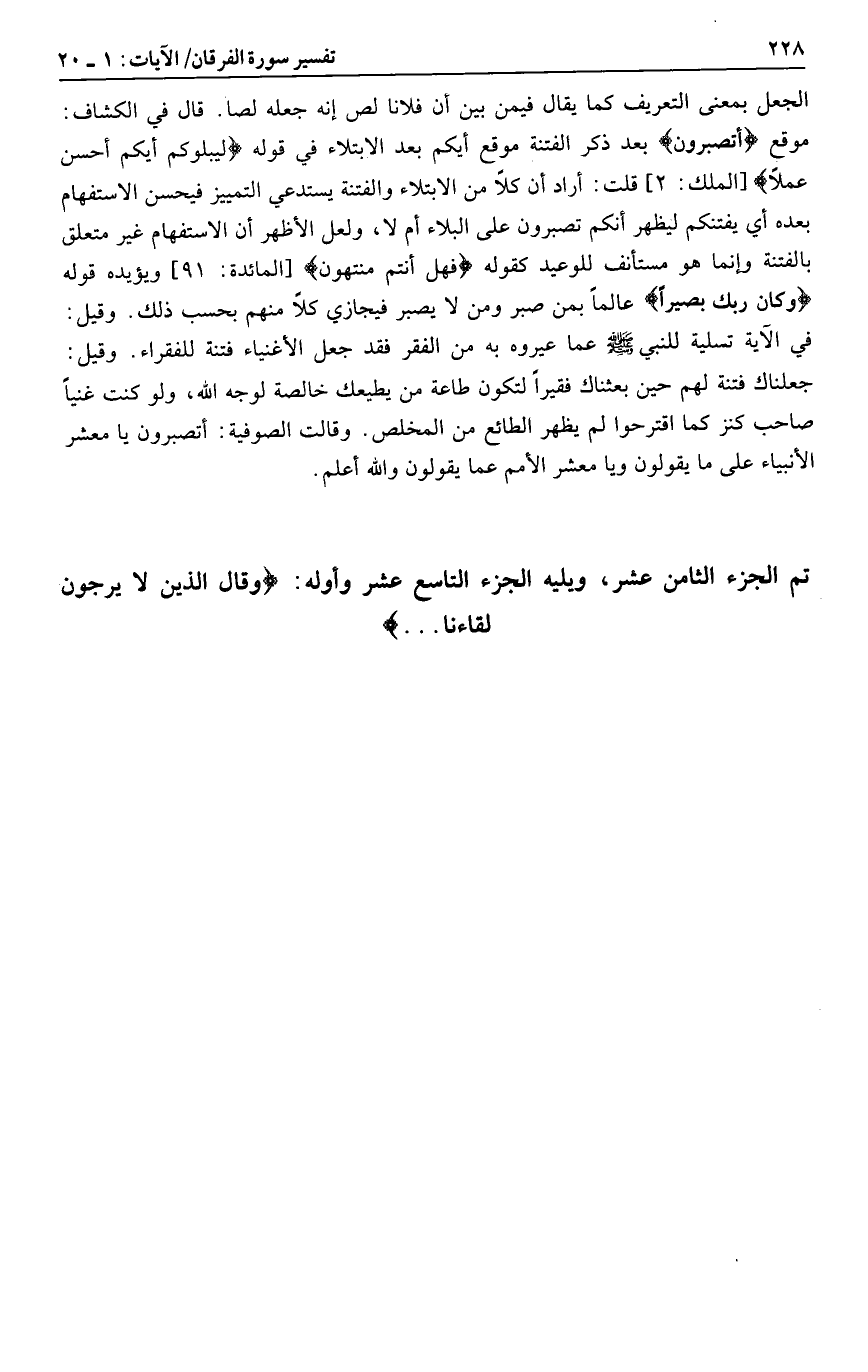 تم الجزء الثامن عشر، ويليه الجزء التاسع عشر وأوله: وَقالَ الَّذِينَ لا يَرْجُونَ لِقاءَنا ...