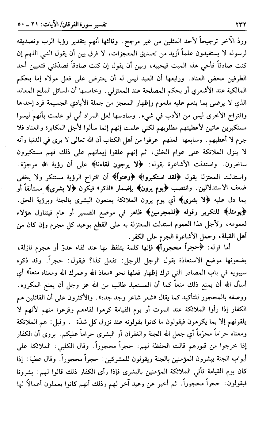 أما قوله: حِجْراً مَحْجُوراً فإنها كلمة يتلفظ بها عند لقاء عدوّ أو هجوم نازلة، يضعونها موضع الاستعاذة يقول الرجل للرجل: تفعل كذا؟ فيقول: حجرا. وقد ذكره سيبويه في باب المصادر التي ترك إظهار فعلها نحو «معاذ الله وعمرك الله ومعناه منعا» أي أسأل الله أن يمنع ذلك منعا كما أن المستعيذ طالب من الله عز وجل أن يمنع المكروه.