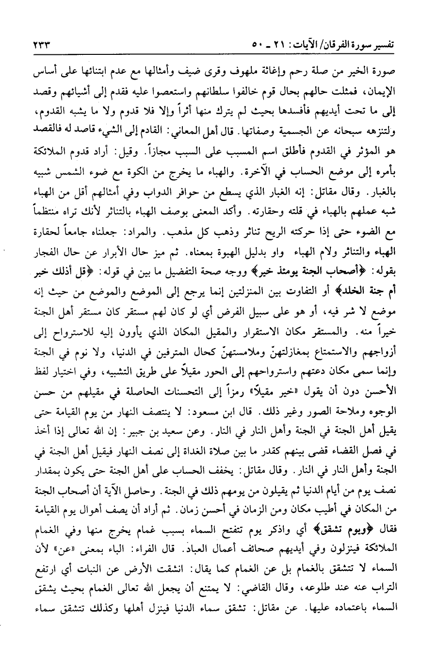 صورة الخير من صلة رحم وإغاثة ملهوف وقرى ضيف وأمثالها مع عدم ابتنائها على أساس الإيمان، فمثلت حالهم بحال قوم خالفوا سلطانهم واستعصوا عليه فقدم إلى أشيائهم وقصد إلى ما تحت أيديهم فأفسدها بحيث لم يترك منها أثرا وإلا فلا قدوم ولا ما يشبه القدوم، ولتنزهه سبحانه عن الجسمية وصفاتها. قال أهل المعاني: القادم إلى الشيء قاصد له فالقصد هو المؤثر في القدوم فأطلق اسم المسبب على السبب مجازا. وقيل: أراد قدوم الملائكة بأمره إلى موضع الحساب في الآخرة. والهباء ما يخرج من الكوة مع ضوء الشمس شبيه بالغبار. وقال مقاتل: إنه الغبار الذي يسطع من حوافر الدواب وفي أمثالهم أقل من الهباء شبه عملهم بالهباء في قلته وحقارته. وأكد المعنى بوصف الهباء بالتناثر لأنك تراه منتظما مع الضوء حتى إذا حركته الريح تناثر وذهب كل مذهب. والمراد: جعلناه جامعا لحقارة الهباء والتناثر ولام الهباء واو بدليل الهبوة بمعناه. ثم ميز حال الأبرار عن حال الفجار بقوله: أَصْحابُ الْجَنَّةِ يَوْمَئِذٍ خَيْرٌ ووجه صحة التفضيل ما بين في قوله: قُلْ أَذلِكَ خَيْرٌ أَمْ جَنَّةُ الْخُلْدِ أو التفاوت بين المنزلتين إنما يرجع إلى الموضع والموضع من حيث إنه موضع لا شر فيه، أو هو على سبيل الفرض أي لو كان لهم مستقر كان مستقر أهل الجنة خيرا منه. والمستقر مكان الاستقرار والمقيل المكان الذي يأوون إليه للاسترواح إلى أزواجهم والاستمتاع بمغازلتهنّ وملامستهنّ كحال المترفين في الدنيا، ولا نوم في الجنة وإنما سمى مكان دعتهم واسترواحهم إلى الحور مقيلا على طريق التشبيه، وفي اختيار لفظ الأحسن دون أن يقول «خير مقيلا» رمزا إلى التحسنات الحاصلة في مقيلهم من حسن الوجوه وملاحة الصور وغير ذلك. قال ابن مسعود: لا ينتصف النهار من يوم القيامة حتى يقيل أهل الجنة في الجنة وأهل النار في النار. وعن سعيد بن جبير: إن الله تعالى إذا أخذ في فصل القضاء قضى بينهم كقدر ما بين صلاة الغداة إلى نصف النهار فيقيل أهل الجنة في الجنة وأهل النار في النار. وقال مقاتل: يخفف الحساب على أهل الجنة حتى يكون بمقدار نصف يوم من أيام الدنيا ثم يقيلون من يومهم ذلك في الجنة. وحاصل الآية أن أصحاب الجنة من المكان في أطيب مكان ومن الزمان في أحسن زمان. ثم أراد أن يصف أهوال يوم القيامة فقال وَيَوْمَ تَشَقَّقُ أي واذكر يوم تتفتح السماء بسبب غمام يخرج منها وفي الغمام الملائكة فينزلون وفي أيديهم صحائف أعمال العباد. قال الفراء: الباء بمعنى «عن» لأن السماء لا تتشقق بالغمام بل عن الغمام كما يقال: انشقت الأرض عن النبات أي ارتفع التراب عنه عند طلوعه، وقال القاضي: لا يمتنع أن يجعل الله تعالى الغمام بحيث يشقق السماء باعتماده عليها. عن مقاتل: تشقق سماء الدنيا فينزل أهلها وكذلك تتشقق سماء