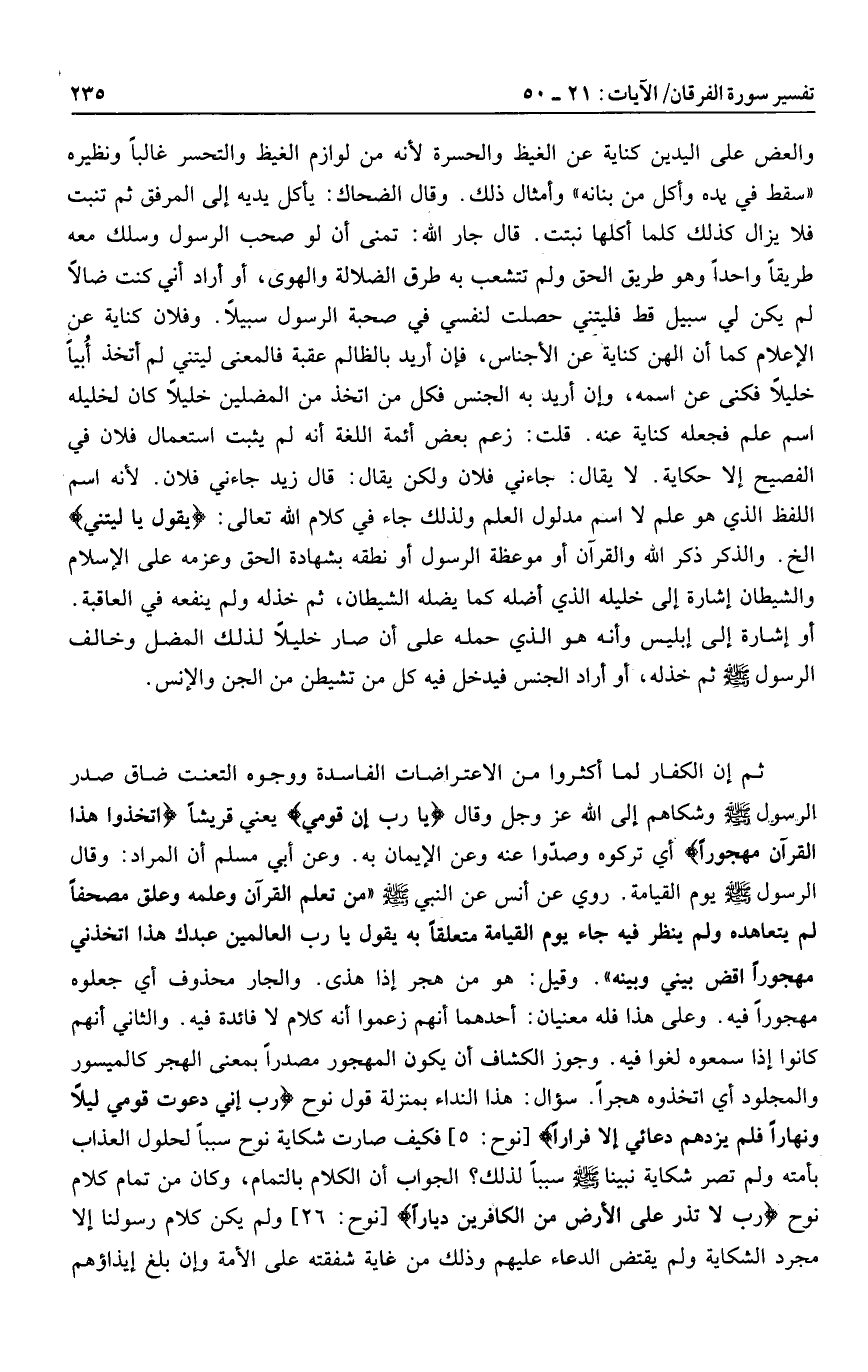 ثم إن الكفار لما أكثروا من الاعتراضات الفاسدة ووجوه التعنت ضاق صدر الرسول صلى الله عليه وسلم وشكاهم إلى الله عز وجل وقال يا رَبِّ إِنَّ قَوْمِي يعني قريشا اتَّخَذُوا هذَا الْقُرْآنَ مَهْجُوراً أي تركوه وصدّوا عنه وعن الإيمان به.
