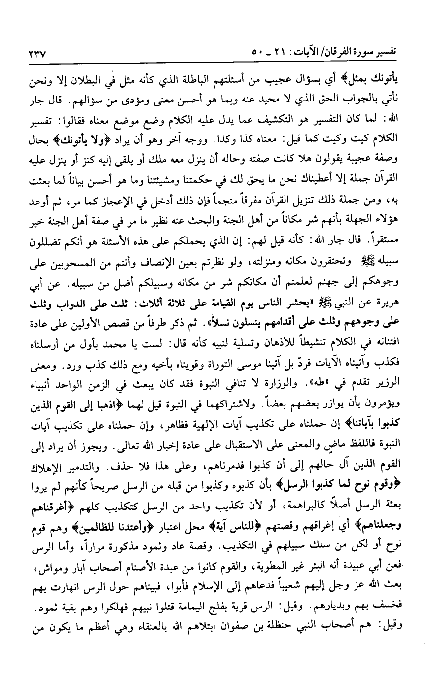 وَلا يَأْتُونَكَ بِمَثَلٍ أي بسؤال عجيب من أسئلتهم الباطلة الذي كأنه مثل في البطلان إلا ونحن نأتي بالجواب الحق الذي لا محيد عنه وبما هو أحسن معنى ومؤدى من سؤالهم. قال جار الله: لما كان التفسير هو التكشيف عما يدل عليه الكلام وضع موضع معناه فقالوا: تفسير الكلام كيت وكيت كما قيل: معناه كذا وكذا. ووجه آخر وهو أن يراد وَلا يَأْتُونَكَ بحال وصفة عجيبة يقولون هلا كانت صفته وحاله أن ينزل معه ملك أو يلقى إليه كنز أو ينزل عليه القرآن جملة إلا أعطيناك نحن ما يحق لك في حكمتنا ومشيئتنا وما هو أحسن بيانا لما بعثت به، ومن جملة ذلك تنزيل القرآن مفرقا منجما فإن ذلك أدخل في الإعجاز كما مر، ثم أوعد هؤلاء الجهلة بأنهم شر مكانا من أهل الجنة والبحث عنه نظير ما مر في صفة أهل الجنة خير مستقرا. قال جار الله: كأنه قيل لهم: إن الذي يحملكم على هذه الأسئلة هو أنكم تضللون سبيله صلى الله عليه وسلم وتحتقرون مكانه ومنزلته، ولو نظرتم بعين الإنصاف وأنتم من المسحوبين على وجوهكم إلى جهنم لعلمتم أن مكانكم شر من مكانه وسبيلكم أضل من سبيله.