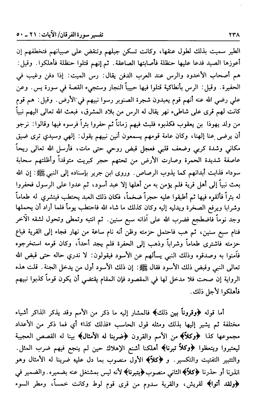 أما قوله وَقُرُوناً بَيْنَ ذلِكَ فالمشار إليه ما ذكر من الأمم وقد يذكر الذاكر أشياء مختلفة ثم يشير إليها بذلك ومثله قول الحاسب «فذلك كذا» أي فما ذكر من الأعداد مجموعها كذا وَكُلًّا من الأمم والقرون ضَرَبْنا لَهُ الْأَمْثالَ بينا له القصص العجيبة ليعتبروا ويتعظوا وَكُلًّا تَبَّرْنا أهلكنا أشنع الإهلاك حين لم ينجع فيهم ضرب المثل.