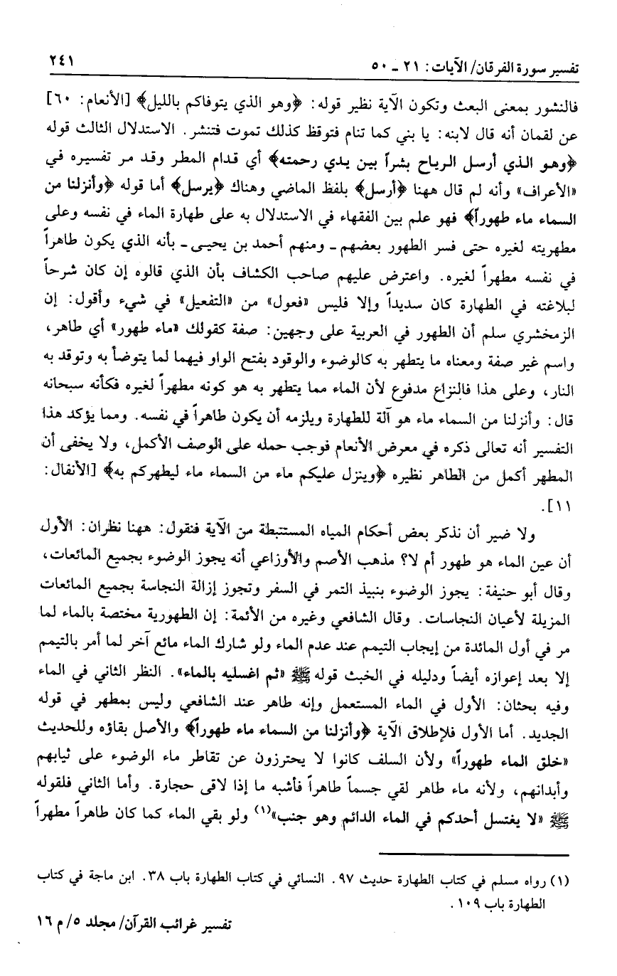 فالنشور بمعنى البعث وتكون الآية نظير قوله: وَهُوَ الَّذِي يَتَوَفَّاكُمْ بِاللَّيْلِ [الأنعام: 60] عن لقمان أنه قال لابنه: يا بني كما تنام فتوقظ كذلك تموت فتنشر. الاستدلال الثالث قوله وَهُوَ الَّذِي أَرْسَلَ الرِّياحَ بُشْراً بَيْنَ يَدَيْ رَحْمَتِهِ أي قدام المطر وقد مر تفسيره في «الأعراف» وأنه لم قال هاهنا أَرْسَلَ بلفظ الماضي وهناك يُرْسِلُ أما قوله وَأَنْزَلْنا مِنَ السَّماءِ ماءً طَهُوراً فهو علم بين الفقهاء في الاستدلال به على طهارة الماء في نفسه وعلى مطهريته لغيره حتى فسر الطهور بعضهم- ومنهم أحمد بن يحيى- بأنه الذي يكون طاهرا في نفسه مطهرا لغيره. واعترض عليهم صاحب الكشاف بأن الذي قالوه إن كان شرحا لبلاغته في الطهارة كان سديدا وإلا فليس «فعول» من «التفعيل» في شيء وأقول: إن الزمخشري سلم أن الطهور في العربية على وجهين: صفة كقولك «ماء طهور» أي طاهر، واسم غير صفة ومعناه ما يتطهر به كالوضوء والوقود بفتح الواو فيهما لما يتوضأ به وتوقد به النار، وعلى هذا فالنزاع مدفوع لأن الماء مما يتطهر به هو كونه مطهرا لغيره فكأنه سبحانه قال: وأنزلنا من السماء ماء هو آلة للطهارة ويلزمه أن يكون طاهرا في نفسه. ومما يؤكد هذا التفسير أنه تعالى ذكره في معرض الأنعام فوجب حمله على الوصف الأكمل، ولا يخفى أن المطهر أكمل من الطاهر نظيره وَيُنَزِّلُ عَلَيْكُمْ مِنَ السَّماءِ ماءً لِيُطَهِّرَكُمْ بِهِ [الأنفال:
