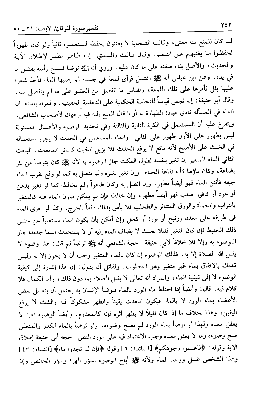 فذلك الوضوء إن كان بالماء المتغير وجب أن لا يجوز إلا به وليس كذلك بالاتفاق بماء غير متغير وهو المطلوب. ولقائل أن يقول: إن هذا إشارة إلى كيفية الوضوء لا إلى كيفية الماء، والمراد أنه تعالى لا يقبل الصلاة بما دون ذلك، وأما الكمال فلا كلام فيه. قال: وأيضا إذا اختلط ماء الورد بالماء فتوضأ الإنسان به يحتمل أن ينغسل بعض الأعضاء بماء الورد لا بالماء فيكون الحدث يقينا والطهر مشكوكا فيه والشك لا يرفع اليقين، وهذا بخلاف ما إذا كان قليلا لا يظهر أثره فإنه كالمعدوم. وأيضا الوضوء تعبد لا يعقل معناه ولهذا لو توضأ بماء الورد لم يصح وضوءه، ولو توضأ بالماء الكدر والمتعفن صح وضوءه وما لا يعقل معناه وجب الاعتماد فيه على مورد النص. حجة أبي حنيفة إطلاق الآية وقوله: فَاغْسِلُوا وُجُوهَكُمْ [المائدة: 6] وقوله فَلَمْ تَجِدُوا ماءً [النساء: 43] وهذا الشخص غسل ووجد الماء ولأنه صلى الله عليه وسلم أباح الوضوء بسؤر الهرة وسؤر الحائض وإن
