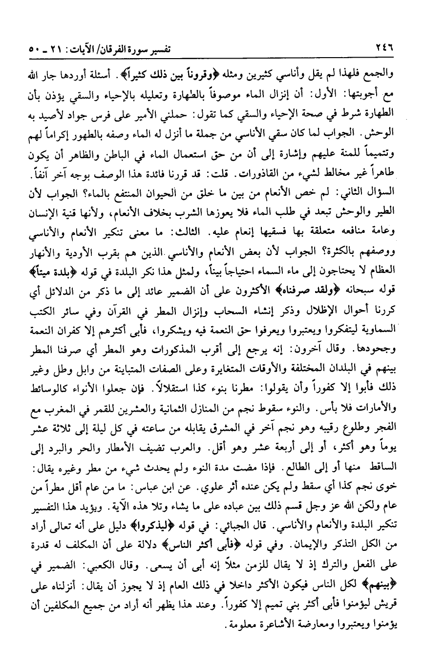 السؤال الثاني: لم خص الأنعام من بين ما خلق من الحيوان المنتفع بالماء؟ الجواب لأن الطير والوحش تبعد في طلب الماء فلا يعوزها الشرب بخلاف الأنعام، ولأنها قنية الإنسان وعامة منافعه متعلقة بها فسقيها إنعام عليه. الثالث: ما معنى تنكير الأنعام والأناسي ووصفهم بالكثرة؟ الجواب لأن بعض الأنعام والأناسي الذين هم بقرب الأودية والأنهار العظام لا يحتاجون إلى ماء السماء احتياجا بينا، ولمثل هذا نكر البلدة في قوله بَلْدَةً مَيْتاً قوله سبحانه وَلَقَدْ صَرَّفْناهُ الأكثرون على أن الضمير عائد إلى ما ذكر من الدلائل أي كررنا أحوال الإظلال وذكر إنشاء السحاب وإنزال المطر في القرآن وفي سائر الكتب السماوية ليتفكروا ويعتبروا ويعرفوا حق النعمة فيه ويشكروا، فأبى أكثرهم إلا كفران النعمة وجحودها. وقال آخرون: إنه يرجع إلى أقرب المذكورات وهو المطر أي صرفنا المطر بينهم في البلدان المختلفة والأوقات المتغايرة وعلى الصفات المتباينة من وابل وطل وغير ذلك فأبوا إلا كفورا وأن يقولوا: مطرنا بنوء كذا استقلالا. فإن جعلوا الأنواء كالوسائط والأمارات فلا بأس. والنوء سقوط نجم من المنازل الثمانية والعشرين للقمر في المغرب مع الفجر وطلوع رقيبه وهو نجم آخر في المشرق يقابله من ساعته في كل ليلة إلى ثلاثة عشر يوما وهو أكثر، أو إلى أربعة عشر وهو أقل. والعرب تضيف الأمطار والحر والبرد إلى الساقط منها أو إلى الطالع. فإذا مضت مدة النوء ولم يحدث شيء من مطر وغيره يقال: