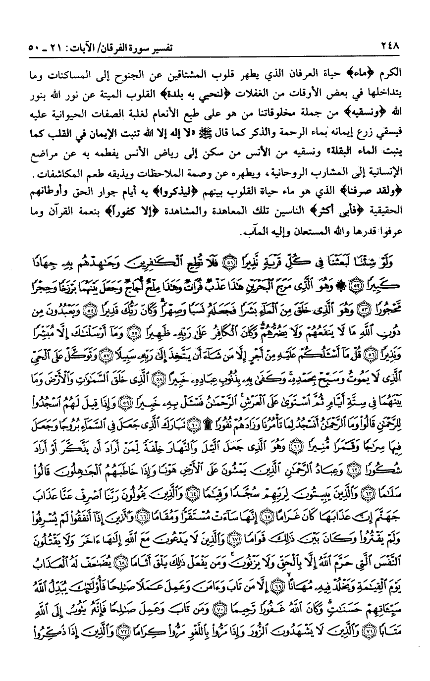 وَلَوْ شِئْنا لَبَعَثْنا فِي كُلِّ قَرْيَةٍ نَذِيراً (51) فَلا تُطِعِ الْكافِرِينَ وَجاهِدْهُمْ بِهِ جِهاداً كَبِيراً (52) وَهُوَ الَّذِي مَرَجَ الْبَحْرَيْنِ هذا عَذْبٌ فُراتٌ وَهذا مِلْحٌ أُجاجٌ وَجَعَلَ بَيْنَهُما بَرْزَخاً وَحِجْراً مَحْجُوراً (53) وَهُوَ الَّذِي خَلَقَ مِنَ الْماءِ بَشَراً فَجَعَلَهُ نَسَباً وَصِهْراً وَكانَ رَبُّكَ قَدِيراً (54) وَيَعْبُدُونَ مِنْ دُونِ اللَّهِ ما لا يَنْفَعُهُمْ وَلا يَضُرُّهُمْ وَكانَ الْكافِرُ عَلى رَبِّهِ ظَهِيراً (55)