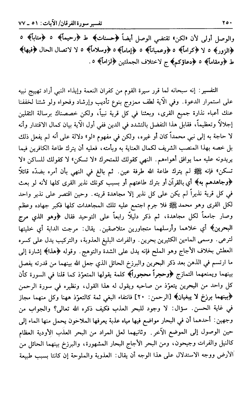 إنه سبحانه لما قرر سيرة القوم من كفران النعمة وإيذاء النبي أراد تهييج نبيه على استمرار الدعوة. وفي الآية لطف ممزوج بنوع تأديب وإرشاد وفحواه ولو شئنا لخففنا عنك أعباء نذارة جميع القرى، وبعثنا في كل قرية نبيا، ولكن خصصناك برسالة الثقلين إجلالا وتعظيما، فقابل هذا التفضل بالتشدد في الدين ففي أول الآية بيان كمال الاقتدار وأنه لا حاجة به إلى نبي محمدا كان أو غيره، ولكن في مفهوم «لو» دلالة على أنه لم يفعل ذلك بل خصه بهذا المنصب الشريف لكمال العناية به وبأمته، فعليه أن يترك طاعة الكافرين فيما يريدونه عليه مما يوافق أهواءهم. النهي كقولك للمتحرك «لا تسكن» لا كقولك للساكن «لا تسكن» فإنه صلى الله عليه وسلم لم يترك طاعة الله طرفة عين. ثم بالغ في النهي بأن أمره بضدّه قائلا وَجاهِدْهُمْ بِهِ أي بالقرآن أو بترك طاعتهم أو بسبب كونك نذير القرى كلها لأنه لو بعث في كل قرية نذيرا لم يكن على كل نذير إلا مجاهدة قريته. وحين اقتصر على نذير واحد لكل القرى وهو محمد صلى الله عليه وسلم فلا جرم اجتمع عليه تلك المجاهدات كلها فكبر جهاده وعظم وصار جامعا لكل مجاهدة، ثم ذكر دليلا رابعا على التوحيد فقال وَهُوَ الَّذِي مَرَجَ الْبَحْرَيْنِ أي خلاهما وأرسلهما متجاورين متلاصقين. يقال: مرجت الدابة أي خليتها لترعى. وسمى الماءين الكثيرين بحرين. والفرات البليغ العذوبة، والتركيب يدل على كسره العطش بخلاف الأجاج وهو الملح فإنه يدل على الشدة والتوهج. وقوله هذا إشارة إلى ما ارتسم في الذهن بعد ذكر البحرين والبرزخ الحائل الذي جعل الله بينهما من قدرته يفصل بينهما ويمنعهما التمازج وَحِجْراً مَحْجُوراً كلمة يقولها المتعوّذ كما قلنا في السورة كأن كل واحد من البحرين يتعوّذ من صاحبه ويقول له هذا القول، ونظيره في سورة الرحمن بَيْنَهُما بَرْزَخٌ لا يَبْغِيانِ [الرحمن: 20] فانتفاء البغي ثمة كالتعوّذ هاهنا وكل منهما مجاز في غاية الحسن. سؤال: لا وجود للبحر العذب فكيف ذكره الله تعالى؟ والجواب من وجهين: أحدهما أن في البحار مواضع فيها مياه عذبة يعرفها الملاحون يحمل منها الماء إلى حين الوصول إلى الموضع الآخر. وثانيهما لعل المراد من البحر العذب الأودية العظام كالنيل والفرات وجيحون، ومن البحر الأجاج البحار المشهورة، والبرزخ بينهما الحائل من الأرض ووجه الاستدلال على هذا الوجه أن يقال: العذوبة والملوحة إن كانتا بسبب طبيعة