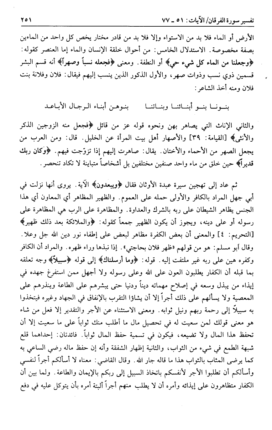 وَجَعَلْنا مِنَ الْماءِ كُلَّ شَيْءٍ حَيٍّ أو النطفة. ومعنى فَجَعَلَهُ نَسَباً وَصِهْراً أنه قسم البشر قسمين ذوي نسب وذوات صهر، والأول الذكور الذين ينسب إليهم فيقال: فلان وفلانة بنت فلان ومنه أخذ الشاعر: