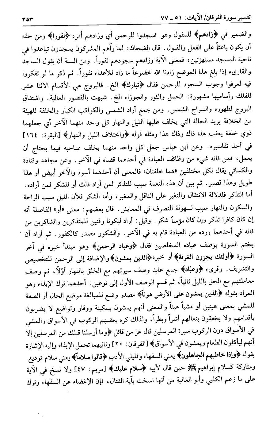 والضمير في زادَهُمْ للمقول وهو اسجدوا للرحمن أي وزادهم أمره نُفُوراً ومن حقه أن يكون باعثا على الفعل والقبول. قال الضحاك: لما رآهم المشركون يسجدون تباعدوا في ناحية المسجد مستهزئين، فمعنى الآية وزادهم سجودهم نفورا. ومن السنة أن يقول الساجد والقارئ إذا بلغ هذا الموضع زادنا الله خضوعا ما زاد للأعداء نفورا. ثم ذكر ما لو تفكروا فيه لعرفوا وجوب السجود للرحمن فقال تَبارَكَ إلخ. فالبروج هي الأقسام الاثنا عشر للفلك وأساميها مشهورة: الحمل والثور والجوزاء إلخ. شبهت بالقصور العالية. واشتقاق البروج لظهوره والسراج الشمس. ومن جمع أراد الشمس والكواكب الكبار والخلفة للهيئة من الخلافة يريد الحالة التي يخلف عليها الليل والنهار كل واحد منهما الآخر أي جعلهما ذوي خلفة يعقب هذا ذاك وذاك هذا ومثله قوله وَاخْتِلافِ اللَّيْلِ وَالنَّهارِ [البقرة: 164] في أحد تفاسيره. وعن ابن عباس جعل كل واحد منهما يخلف صاحبه فيما يحتاج أن يعمل، فمن فاته شيء من وظائف العبادة في أحدهما قضاه في الآخر. وعن مجاهد وقتادة والكسائي يقال لكل مختلفين «هما خلفتان» فالمعنى أن أحدهما أسود والآخر أبيض أو هذا طويل وهذا قصير. ثم بين أن هذه النعمة سبب للتذكر لمن أراد ذلك أو للشكر لمن أراده.