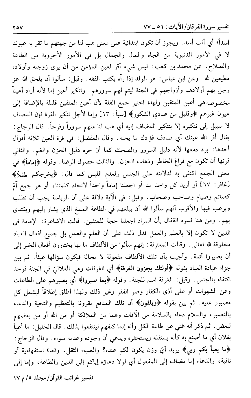 يقال أقر الله عينك أي صادف فؤادك ما يحبه. وقال المفضل: في قرة العين ثلاثة أقوال أحدها: برد دمعها لأنه دليل السرور والضحك كما أن حره دليل الحزن والغم. والثاني قرتها أن تكون مع فراغ الخاطر وذهاب الحزن. والثالث حصول الرضا. وقوله إِماماً في معنى الجمع اكتفى به لدلالته على الجنس ولعدم اللبس كما قال: يُخْرِجُكُمْ طِفْلًا [غافر: 67] أو أريد كل واحد منا أو اجعلنا إماما واحدا لاتحاد كلمتنا، أو هو جمع آمّ كصائم وصيام وصاحب وصحاب. وقيل: في الآية دلالة على أن الرياسة يجب أن تطلب ويرغب فيها والأقرب أنهم سألوا الله أن يبلغهم في الطاعة المبلغ الذي يشار إليهم ويقتدى بهم. ومن هنا فسره القفال بأن المراد اجعلنا حجة للمتقين. قالت الاشاعرة: الإمامة في الدين لا تكون إلا بالعلم والعمل فدل ذلك على أن العلم والعمل بل جميع أفعال العباد مخلوقة لله تعالى. وقالت المعتزلة: إنهم سألوا من الألطاف ما بها يختارون أفعال الخير إلى أن يصيروا أئمة. وأجيب بأن تلك الألطاف مفعولة لا محالة فيكون سؤالها عبثا. ثم بين جزاء عبادة العباد بقوله أُوْلئِكَ يُجْزَوْنَ الْغُرْفَةَ أي الغرفات وهي العلاليّ في الجنة فوحد اكتفاء بالجنس. وقيل: الغرفة اسم للجنة. وقوله بِما صَبَرُوا أي بصبرهم على الطاعات وعن الشهوات أو على أذى الكفار وضر الفقر وغير ذلك ولهذا أطلق إطلاقا ليشمل كل مصبور عليه. ثم بين بقوله وَيُلَقَّوْنَ أن تلك المنافع مقرونة بالتعظيم والتحية والدعاء بالتعمير، والسلام دعاء بالسلامة من الآفات وهما من الملائكة أو من الله أو من بعضهم لبعض. ثم ذكر أنه غني عن طاعة الكل وأنه إنما كلفهم لينتفعوا بذلك. قال الخليل: ما أعبأ بفلان أي ما أصنع به كأنه يستقله ويستحقره ويدعي أن وجوده وعدمه سواء. وقال الزجاج: