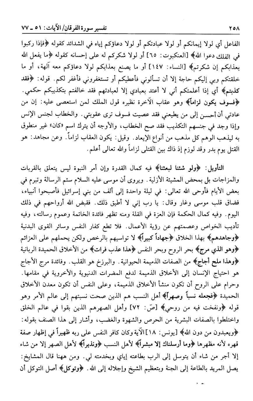 وفيه كمال الحكمة فإن العزة في القلة ومنه تظهر فائدة الخاتمة وعموم رسالته، وفيه تأديب الخواص وعصمتهم عن رؤية الأعمال. فلا تطع كفار النفس وسائر القوى البدنية وَجاهِدْهُمْ بهذا الخلاق جِهاداً كَبِيراً لا تواسيهم بالرخص ولكن يحملهم على العزائم وَهُوَ الَّذِي مَرَجَ بحر الروح وبحر النفس هذا عَذْبٌ فُراتٌ من الأخلاق الحميدة الربانية وَهذا مِلْحٌ أُجاجٌ من الصفات الذميمة الحيوانية. والبرزخ هو القلب. وفائدة مرج الأجاج هو احتياج الإنسان إلى الأخلاق الذميمة لدفع المضرات الدنيوية والأخروية في مقامها.
