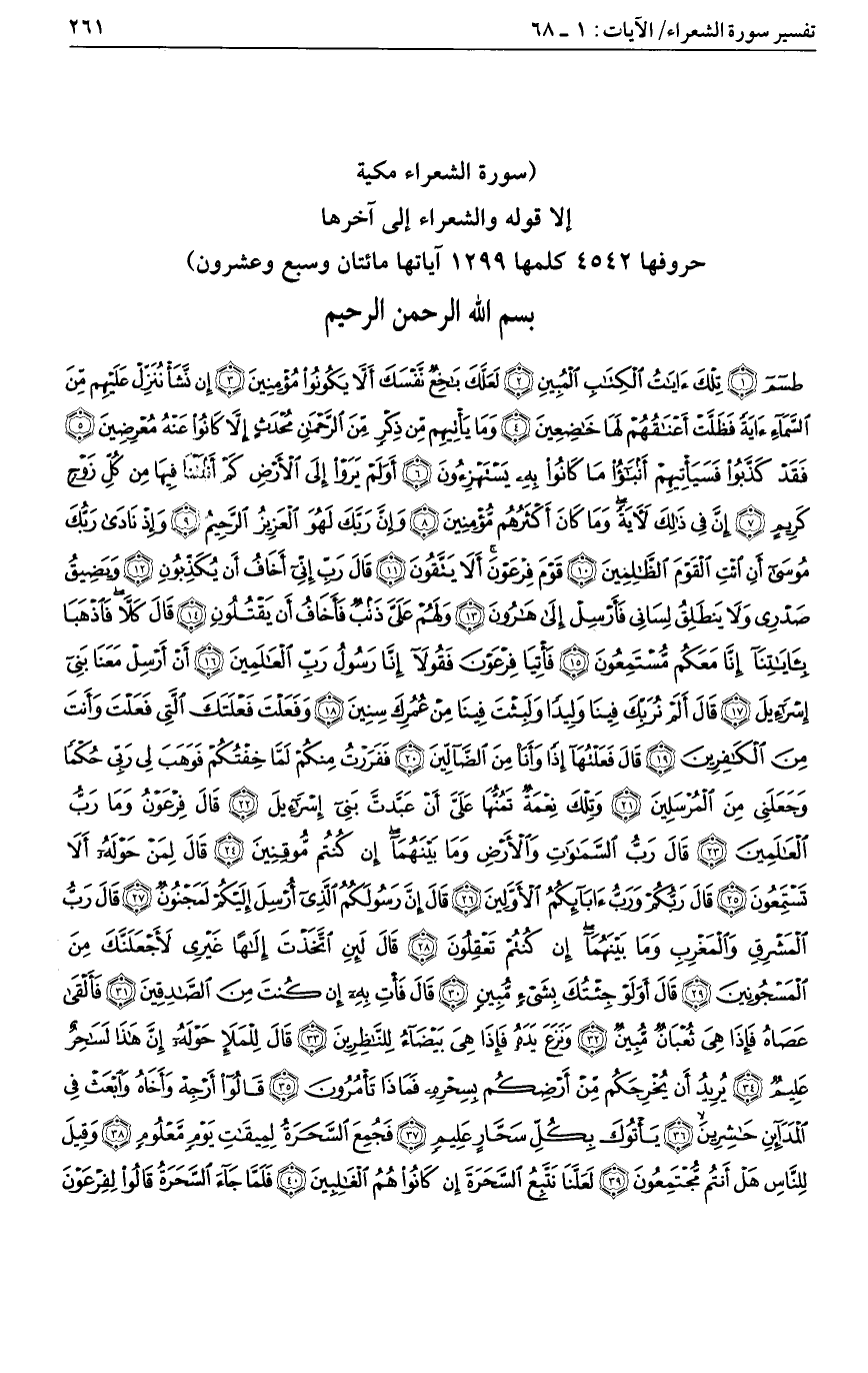 (مكية إلا قوله والشعراء إلى آخرها حروفها 4542 كلمها 1299 آياتها مائتان وسبع وعشرون)