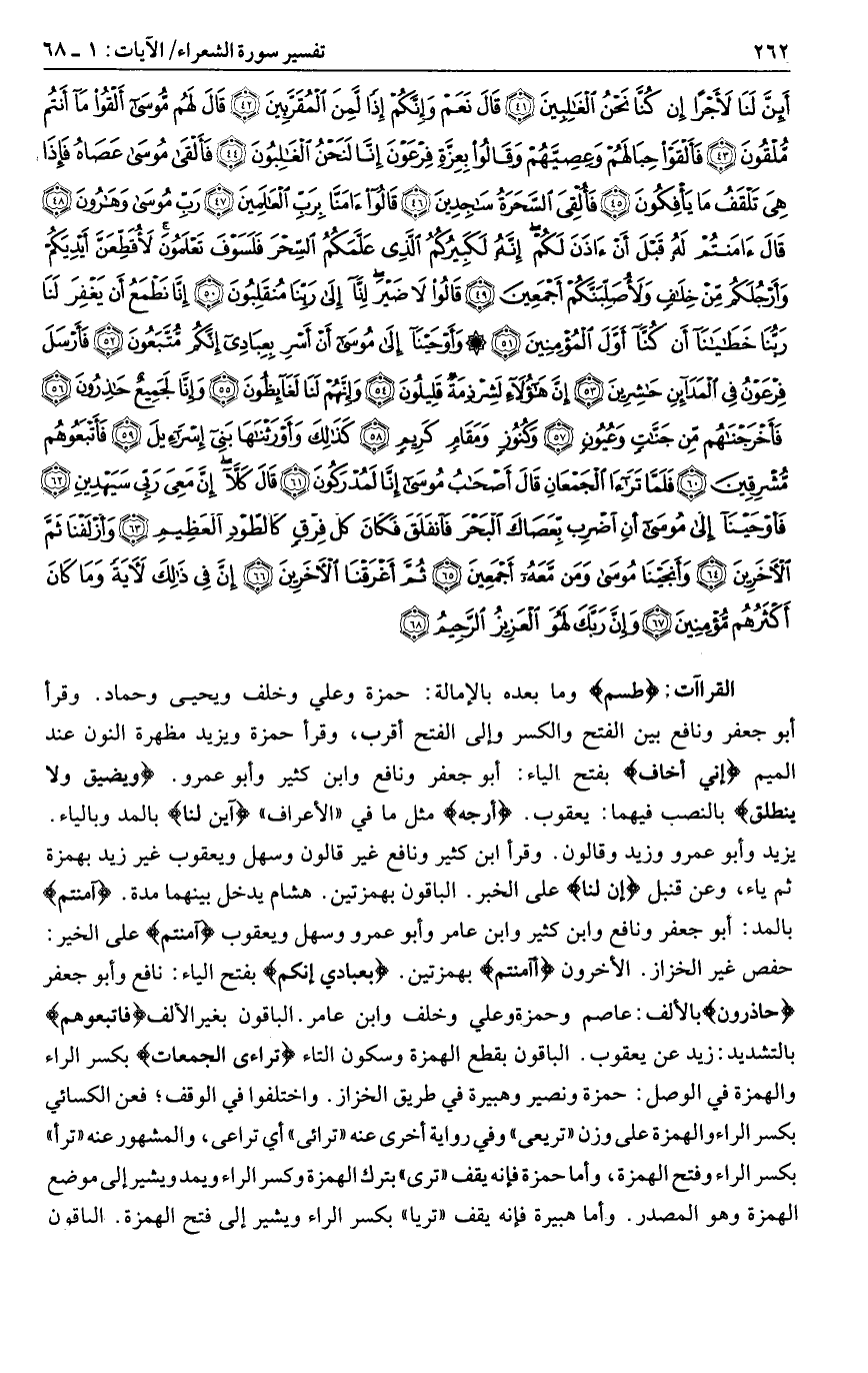 طسم وما بعده بالإمالة: حمزة وعلي وخلف ويحيى وحماد. وقرأ أبو جعفر ونافع بين الفتح والكسر وإلى الفتح أقرب، وقرأ حمزة ويزيد مظهرة النون عند الميم إِنِّي أَخافُ بفتح الياء: أبو جعفر ونافع وابن كثير وأبو عمرو. ويضيق ولا ينطلق بالنصب فيهما: يعقوب. أَرْجِهْ مثل ما في «الأعراف» اين لنا بالمد وبالياء.