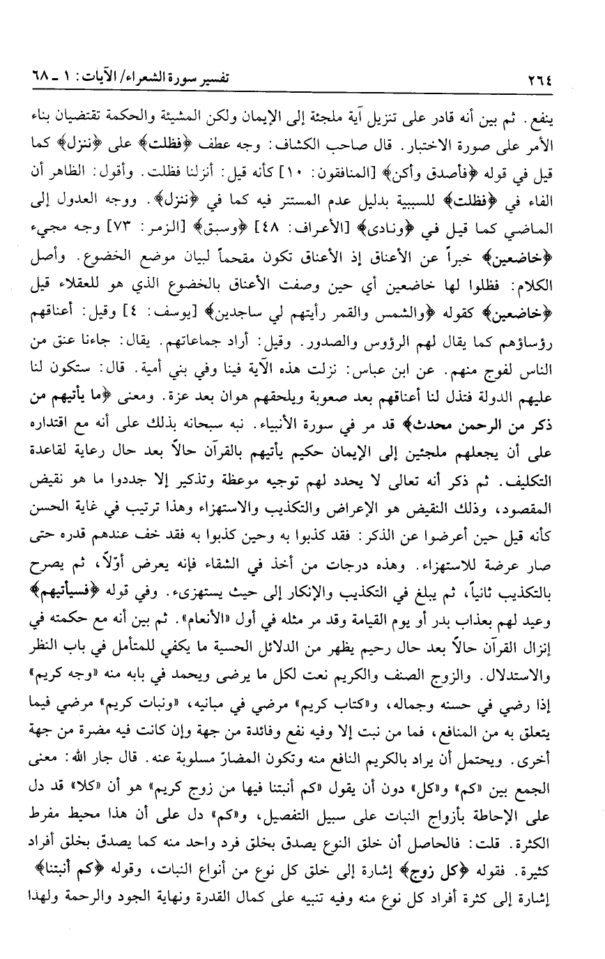 ينفع. ثم بين أنه قادر على تنزيل آية ملجئة إلى الإيمان ولكن المشيئة والحكمة تقتضيان بناء الأمر على صورة الاختبار. قال صاحب الكشاف: وجه عطف فَظَلَّتْ على نُنَزِّلْ كما قيل في قوله فَأَصَّدَّقَ وَأَكُنْ [المنافقون: 10] كأنه قيل: أنزلنا فظلت. وأقول: الظاهر أن الفاء في فَظَلَّتْ للسببية بدليل عدم المستتر فيه كما في نُنَزِّلْ. ووجه العدول إلى الماضي كما قيل في وَنادى [الأعراف: 48] وَسِيقَ [الزمر: 73] وجه مجيء خاضِعِينَ خبرا عن الأعناق إذ الأعناق تكون مقحما لبيان موضع الخضوع. وأصل الكلام: فظلوا لها خاضعين أي حين وصفت الأعناق بالخضوع الذي هو للعقلاء قيل خاضِعِينَ كقوله وَالشَّمْسَ وَالْقَمَرَ رَأَيْتُهُمْ لِي ساجِدِينَ [يوسف: 4] وقيل: أعناقهم رؤساؤهم كما يقال لهم الرؤوس والصدور. وقيل: أراد جماعاتهم. يقال: جاءنا عنق من الناس لفوج منهم. عن ابن عباس: نزلت هذه الآية فينا وفي بني أمية. قال: ستكون لنا عليهم الدولة فتذل لنا أعناقهم بعد صعوبة ويلحقهم هوان بعد عزة. ومعنى ما يَأْتِيهِمْ مِنْ ذِكْرٍ مِنَ الرَّحْمنِ مُحْدَثٍ قد مر في سورة الأنبياء. نبه سبحانه بذلك على أنه مع اقتداره على أن يجعلهم ملجئين إلى الإيمان حكيم يأتيهم بالقرآن حالا بعد حال رعاية لقاعدة التكليف. ثم ذكر أنه تعالى لا يحدد لهم توجيه موعظة وتذكير إلا جددوا ما هو نقيض المقصود، وذلك النقيض هو الإعراض والتكذيب والاستهزاء وهذا ترتيب في غاية الحسن كأنه قيل حين أعرضوا عن الذكر: فقد كذبوا به وحين كذبوا به فقد خف عندهم قدره حتى صار عرضة للاستهزاء. وهذه درجات من أخذ في الشقاء فإنه يعرض أوّلا، ثم يصرح بالتكذيب ثانيا، ثم يبلغ في التكذيب والإنكار إلى حيث يستهزىء. وفي قوله فَسَيَأْتِيهِمْ وعيد لهم بعذاب بدر أو يوم القيامة وقد مر مثله في أول «الأنعام» . ثم بين أنه مع حكمته في إنزال القرآن حالا بعد حال رحيم يظهر من الدلائل الحسية ما يكفي للمتأمل في باب النظر والاستدلال. والزوج الصنف والكريم نعت لكل ما يرضى ويحمد في بابه منه «وجه كريم» إذا رضي في حسنه وجماله، و «كتاب كريم» مرضي في مبانيه، «ونبات كريم» مرضي فيما يتعلق به من المنافع، فما من نبت إلا وفيه نفع وفائدة من جهة وإن كانت فيه مضرة من جهة أخرى. ويحتمل أن يراد بالكريم النافع منه وتكون المضارّ مسلوبة عنه. قال جار الله: معنى الجمع بين «كم» و «كل» دون أن يقول «كم أنبتنا فيها من زوج كريم» هو أن «كلا» قد دل على الإحاطة بأزواج النبات على سبيل التفصيل، و «كم» دل على أن هذا محيط مفرط الكثرة. قلت: فالحاصل أن خلق النوع يصدق بخلق فرد واحد منه كما يصدق بخلق أفراد كثيرة. فقوله كُلِّ زَوْجٍ إشارة إلى خلق كل نوع من أنواع النبات، وقوله كَمْ أَنْبَتْنا إشارة إلى كثرة أفراد كل نوع منه وفيه تنبيه على كمال القدرة ونهاية الجود والرحمة ولهذا