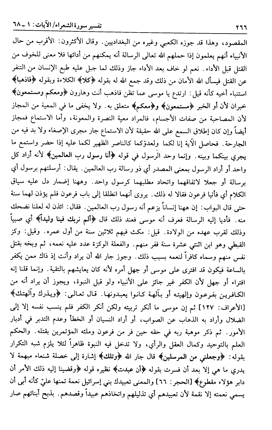 المقصود، وهذا قد جوزه الكعبي وغيره من البغداديين. وقال الأكثرون: الأقرب من حال الأنبياء أنهم يعلمون إذا حملهم الله تعالى الرسالة أنه يمكنهم من أدائها فلا معنى للخوف من القتل قبل الأداء. نعم لو خاف بعد الأداء جاز وذلك لما جبل عليه طبع الإنسان من التنفر عن القتل فيسأل الله الأمان من ذلك وقد جمع الله له بقوله كَلَّا الكلاءة وبقوله فَاذْهَبا استنباء أخيه كأنه قيل: ارتدع يا موسى عما تظن فاذهب أنت وهارون ومَعَكُمْ ومُسْتَمِعُونَ خبران لأن أو الخبر مُسْتَمِعُونَ ومَعَكُمْ متعلق به. ولا يخفى ما في المعية من المجاز لأن المصاحبة من صفات الأجسام، فالمراد معية النصرة والمعونة، وأما الاستماع فمجاز أيضا وإن كان إطلاق السمع على الله حقيقة لأن الاستماع جار مجرى الإصغاء ولا بد فيه من الجارحة. فحاصل الآية إنا لكما ولعدوّ كما كالناصر الظهير لكما عليه إذا حضر واستمع ما يجري بينكما وبينه. وإنما وحد الرسول في قوله نَّا رَسُولُ رَبِّ الْعالَمِينَ