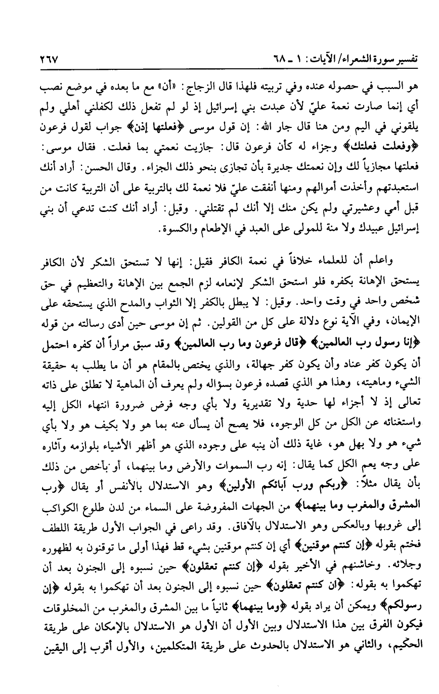قالَ فِرْعَوْنُ وَما رَبُّ الْعالَمِينَ وقد سبق مرارا أن كفره احتمل أن يكون كفر عناد وأن يكون كفر جهالة، والذي يختص بالمقام هو أن ما يطلب به حقيقة الشيء وماهيته، وهذا هو الذي قصده فرعون بسؤاله ولم يعرف أن الماهية لا تطلق على ذاته تعالى إذ لا أجزاء لها حدية ولا تقديرية ولا بأي وجه فرض ضرورة انتهاء الكل إليه واستغنائه عن الكل من كل الوجوه، فلا يصح أن يسأل عنه بما هو ولا بكيف هو ولا بأي شيء هو ولا بهل هو، غاية ذلك أن ينبه على وجوده الذي هو أظهر الأشياء بلوازمه وآثاره على وجه يعم الكل كما يقال: إنه رب السموات والأرض وما بينهما، أو بأخص من ذلك بأن يقال مثلا: رَبُّكُمْ وَرَبُّ آبائِكُمُ الْأَوَّلِينَ وهو الاستدلال بالأنفس أو يقال رَبُّ الْمَشْرِقِ وَالْمَغْرِبِ وَما بَيْنَهُما من الجهات المفروضة على السماء من لدن طلوع الكواكب إلى غروبها وبالعكس وهو الاستدلال بالآفاق. وقد راعى في الجواب الأول طريقة اللطف فختم بقوله إِنْ كُنْتُمْ مُوقِنِينَ أي إن كنتم موقنين بشيء قط فهذا أولى ما توقنون به لظهوره وجلائه. وخاشنهم في الأخير بقوله إِنْ كُنْتُمْ تَعْقِلُونَ حين نسبوه إلى الجنون بعد أن تهكموا به بقوله: إِنْ كُنْتُمْ تَعْقِلُونَ حين نسبوه إلى الجنون بعد أن تهكموا به بقوله إِنَّ رَسُولَكُمُ ويمكن أن يراد بقوله وَما بَيْنَهُما ثانيا ما بين المشرق والمغرب من المخلوقات فيكون الفرق بين هذا الاستدلال وبين الأول أن الأول هو الاستدلال بالإمكان على طريقة الحكيم، والثاني هو الاستدلال بالحدوث على طريقة المتكلمين، والأول أقرب إلى اليقين
