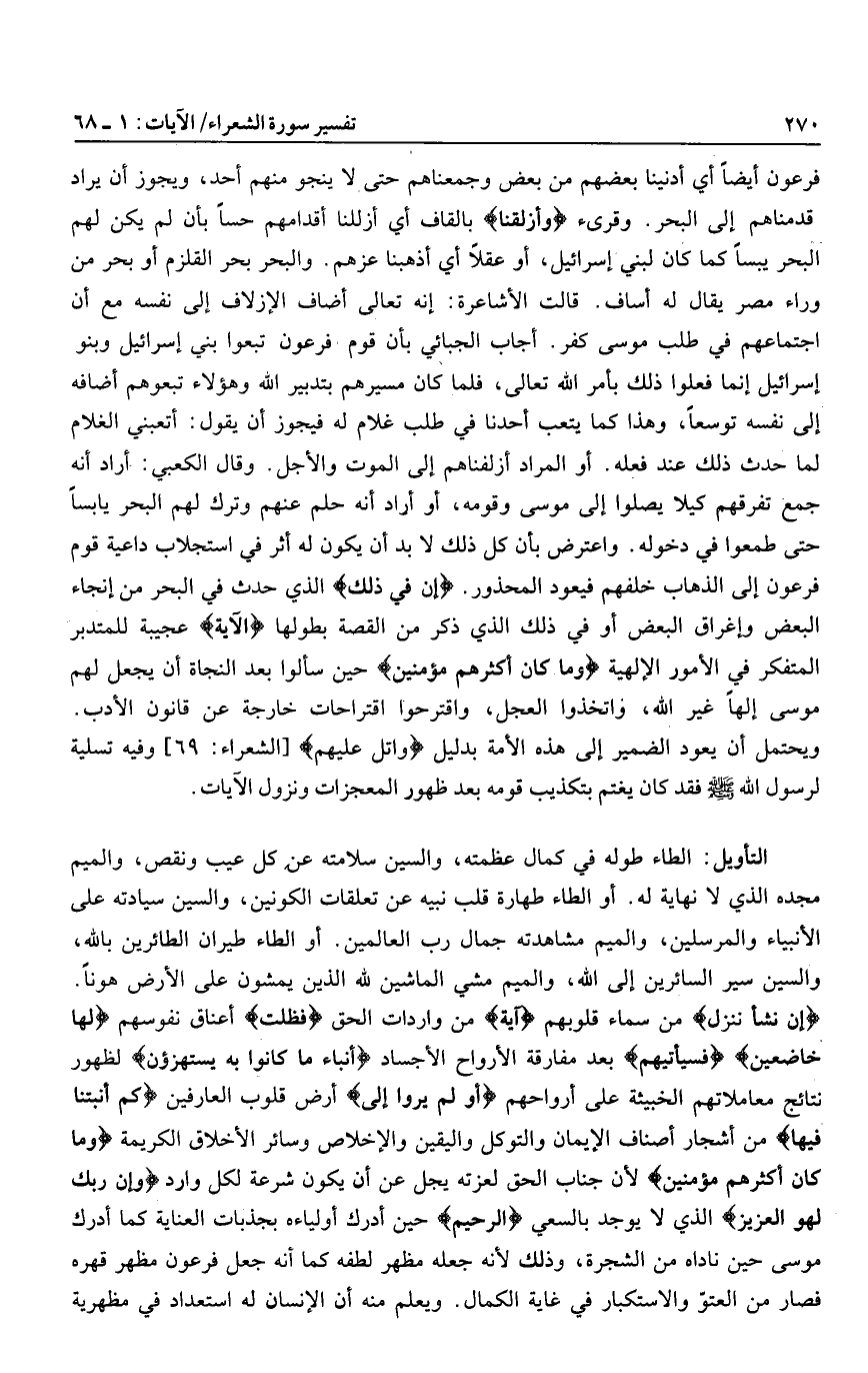 فرعون أيضا أي أدنينا بعضهم من بعض وجمعناهم حتى لا ينجو منهم أحد، ويجوز أن يراد قدمناهم إلى البحر. وقرىء وأزلقنا بالقاف أي أزللنا أقدامهم حسا بأن لم يكن لهم البحر يبسا كما كان لبني إسرائيل، أو عقلا أي أذهبنا عزهم. والبحر بحر القلزم أو بحر من وراء مصر يقال له أساف. قالت الأشاعرة: إنه تعالى أضاف الإزلاف إلى نفسه مع أن اجتماعهم في طلب موسى كفر. أجاب الجبائي بأن قوم فرعون تبعوا بني إسرائيل وبنو إسرائيل إنما فعلوا ذلك بأمر الله تعالى، فلما كان مسيرهم بتدبير الله وهؤلاء تبعوهم أضافه إلى نفسه توسعا، وهذا كما يتعب أحدنا في طلب غلام له فيجوز أن يقول: أتعبني الغلام لما حدث ذلك عند فعله. أو المراد أزلفناهم إلى الموت والأجل. وقال الكعبي: أراد أنه جمع تفرقهم كيلا يصلوا إلى موسى وقومه، أو أراد أنه حلم عنهم وترك لهم البحر يابسا حتى طمعوا في دخوله. واعترض بأن كل ذلك لا بد أن يكون له أثر في استجلاب داعية قوم فرعون إلى الذهاب خلفهم فيعود المحذور. إِنَّ فِي ذلِكَ الذي حدث في البحر من إنجاء البعض وإغراق البعض أو في ذلك الذي ذكر من القصة بطولها الْآيَةَ عجيبة للمتدبر المتفكر في الأمور الإلهية وَما كانَ أَكْثَرُهُمْ مُؤْمِنِينَ حين سألوا بعد النجاة أن يجعل لهم موسى إلها غير الله، واتخذوا العجل، واقترحوا اقتراحات خارجة عن قانون الأدب.