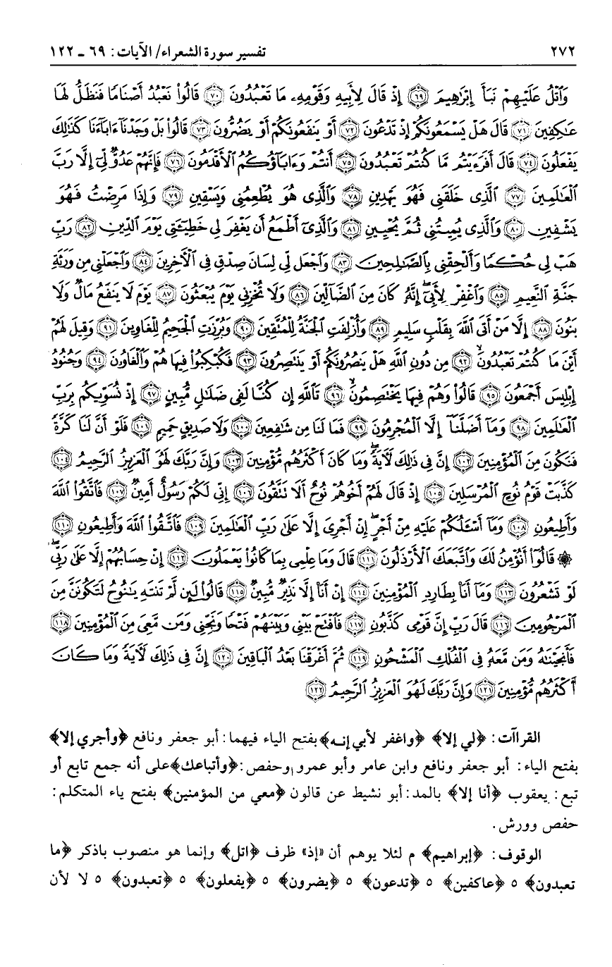 لِي إِلَّا وَاغْفِرْ لِأَبِي إِنَّهُ بفتح الياء فيهما: أبو جعفر ونافع وأَجْرِيَ إِلَّا بفتح الياء: أبو جعفر ونافع وابن عامر وأبو عمرو وحفص: وأتباعك على أنه جمع تابع أو تبع: يعقوب أَنَا إِلَّا بالمد: أبو نشيط عن قالون مَعِيَ مِنَ الْمُؤْمِنِينَ بفتح ياء المتكلم: