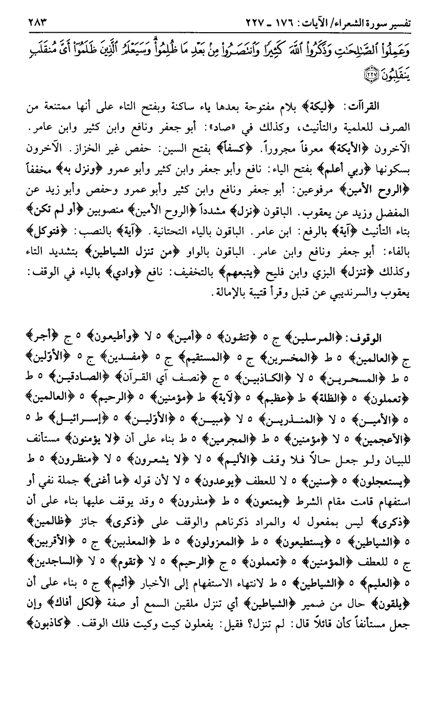 الْمُرْسَلِينَ ج هـ تَتَّقُونَ هـ أَمِينٌ هـ لا وَأَطِيعُونِ هـ ج أَجْرٍ ج الْعالَمِينَ هـ ط الْمُخْسِرِينَ ج هـ الْمُسْتَقِيمِ ج هـ مُفْسِدِينَ ج هـ الْأَوَّلِينَ هـ ط الْمُسَحَّرِينَ هـ لا الْكاذِبِينَ هـ ج نصف آي القرآن الصَّادِقِينَ هـ ط تَعْمَلُونَ هـ الظُّلَّةِ ط عَظِيمٍ هـ لَآيَةً ط مُؤْمِنِينَ هـ الرَّحِيمُ هـ الْعالَمِينَ هـ الْأَمِينُ هـ لا الْمُنْذِرِينَ هـ لا مُبِينٍ هـ الْأَوَّلِينَ هـ إِسْرائِيلَ ط هـ الْأَعْجَمِينَ هـ لا مُؤْمِنِينَ هـ ط الْمُجْرِمِينَ هـ ط بناء على أن لا يُؤْمِنُونَ مستأنف للبيان ولو جعل حالا فلا وقف الْأَلِيمَ هـ لا لا يَشْعُرُونَ هـ لا مُنْظَرُونَ هـ ط يَسْتَعْجِلُونَ هـ سِنِينَ هـ لا للعطف يُوعَدُونَ هـ لا لأن قوله ما أَغْنى جملة نفي أو استفهام قامت مقام الشرط يُمَتَّعُونَ هـ ط مُنْذِرُونَ هـ وقد يوقف عليها بناء على أن ذِكْرى ليس بمفعول له والمراد ذكرناهم والوقف على ذِكْرى جائز ظالِمِينَ هـ الشَّياطِينُ هـ يَسْتَطِيعُونَ هـ ط لَمَعْزُولُونَ هـ ط الْمُعَذَّبِينَ ج هـ الْأَقْرَبِينَ ج هـ للعطف الْمُؤْمِنِينَ هـ تَعْمَلُونَ هـ ج الرَّحِيمِ هـ لا تَقُومُ